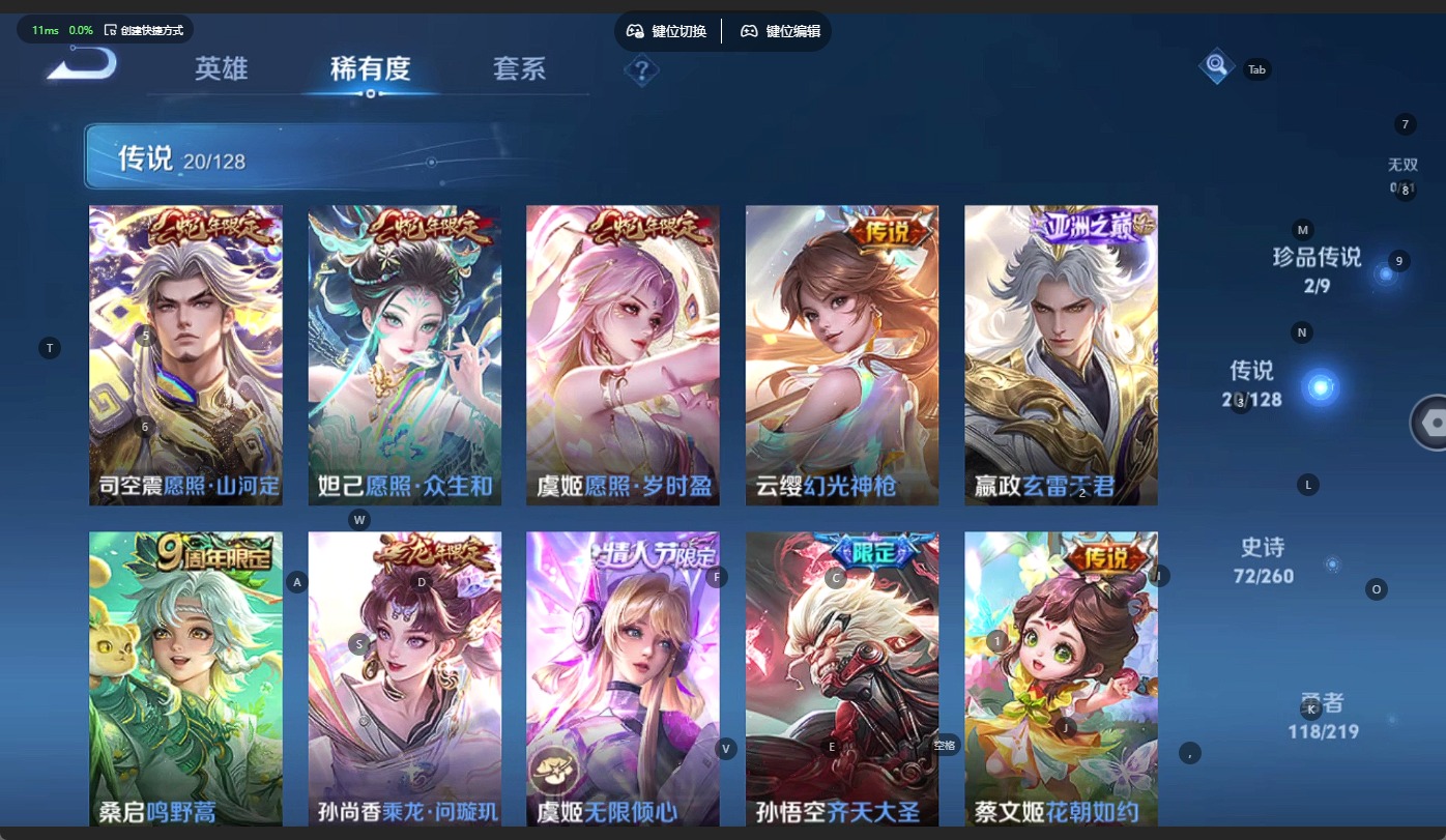 - PX_2109843-Q/最强王者/95皮肤/116英雄/0典藏/0珍品无双/0无双/0珍品传说/4传说/18史诗/7稀有英雄 【4 传说皮肤】炽阳神光 镜,愿照·九州拓 澜,幻光神枪 云缨,鸣野蒿 桑启, 【18 史诗皮肤】无心 元歌,星夜王子 白起,摇滚巨星 嬴政,魅力维加斯 妲己,鹰眼统帅 狄仁杰,傲雪梅枪 韩信,逐浪之夏 李元芳,皇家上将 赵云,圣诞狂欢 吕布,器灵·浮梦炉 赵怀真,地狱岩