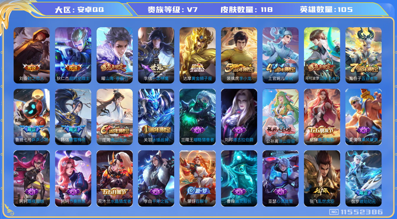 [11552386]V7 5传说 105英雄 118皮肤 可修改实名 优质装备:黄金狮子座,一念神魔,时之恋人-刘备(电焊工),超时空战士-狄仁杰,山海·苍雷引(电光曜子),涂山容容 珍宝阁皮:女武神 限定皮:傲雪梅枪,高山流水,五谷丰年,冰锋战神,梁祝,李小龙,乒乒小将,山海·玄木吟(马可年限) 史诗皮:琥珀纪元伽罗,黄金分割率,千年之狐,江河有灵,百解令(蒙犽),暗夜猫娘,猫狗日记-孙策,乱世虎臣,节奏热浪,修罗,水果甜心,天才门将,功夫厨神,德古拉伯爵,暗隐猎兽者,幽灵船长,暗渊魔法,心灵战警,纤云弄巧,拒霜思,乘风破浪,逐浪之夏,水晶猎龙者,热力回旋,唤灵魅影,鹰眼统帅,魅力维加斯,黎明之约,无心,未来纪元-赵云,玫瑰异探