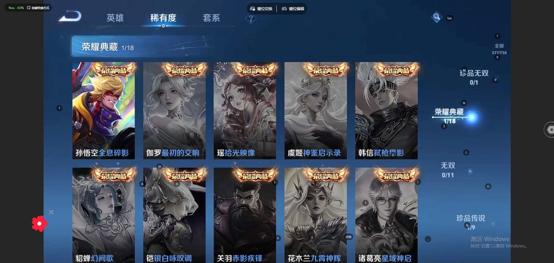 - PX_2096135-18 苹果QQ/至尊星耀/331皮肤/125英雄/1典藏/0珍品无双/0无双/0珍品传说/18传说/89史诗/9稀有英雄 【1 典藏皮肤】全息碎影 孙悟空, 【18 传说皮肤】启明星使 虞姬,碎云 百里守约,白虎志 百里玄策,地狱火 孙悟空,云鹰飞将 曜,永曜之星 杨戬,凤求凰 李白,仲夏夜之梦 貂蝉,地狱之眼 宫本武藏,时雨天司 诸葛亮,黄金狮子座 达摩,久胜战神 干将莫邪