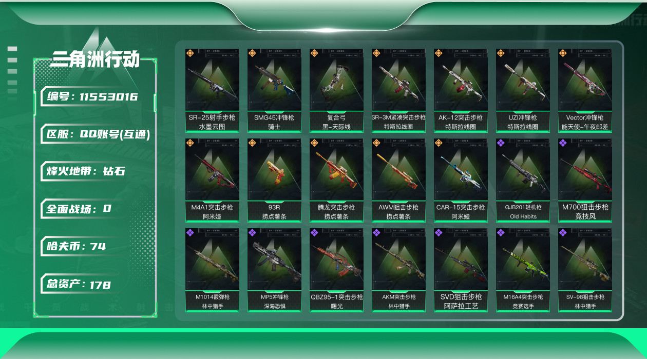 [11553016]总资产:178.2M 12传说枪械 哈夫币:74.133K 可二次 可修改实名 优质装备:顶级安全箱(3x3) 烽火地带段位:钻石 全面战场段位:无段位 传说武器皮肤:SR-25射手步枪-水墨云图,SMG45冲锋枪-骑士,UZI冲锋枪-特斯拉线圈,AWM狙击步枪-捞点薯条,腾龙突击步枪-捞点薯条,93R-捞点薯条,AK-12突击步枪-特斯拉线圈,SR-3M紧凑突击步枪-特斯拉线圈,Vector冲锋枪-能天使-午夜邮差,复合弓-黑-天际线,M4A1突击步枪-阿米娅,CAR-15突击步枪-阿米娅 史诗武器皮肤:SR-3M紧凑突击步枪-英雄,PKM通用机枪-蝮蛇,AUG突击步枪-蝮蛇,M700狙击步枪-蝮蛇,G3战斗步枪-战场英杰,QJB201轻机枪-Old Habits,M1014霰弹枪-林中猎手,MP5冲锋枪-深海恐惧,勇士冲锋枪-深海恐惧,SG552突击步枪-深海恐惧,AKM突击步枪-林中猎手,M16A4突击步枪-竞赛选手,M250通用机枪-囚徒,SV-98狙击步枪-林中猎手,SV-98狙击步枪-囚徒,SCAR-H战斗步枪-囚徒,QBZ95-1突击步枪-曙光,沙漠之鹰-曙光,Vector冲锋枪-阿萨拉文明,SVD狙击步枪-阿萨拉工艺,S12K霰弹枪-曙光,M700狙击步枪-竞技风,QSZ92G-风林火山,93R-博士