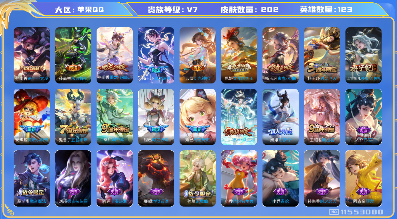 [11553080]V7 1典藏 7传说 123英雄 202皮肤 可修改实名 优质装备:杀手不太冷,末日机甲-孙尚香(绿蚂蚱) 传说皮:乘龙·问璇玑(孙尚香年限),星之鸣奏,幻光神枪 珍宝阁皮:蔷薇恋人 限定皮:愿照·众生和(妲己年限),映山客,鸣野蒿,时之彼端,魔法小厨娘,遇见飞天,五谷丰年,如梦令-嫦娥,女儿国国王,寅虎·心曲(虎婆),时之奇旅-妲己,神器·万象笔 史诗皮:器灵·浮梦炉,茶境仙,炽弈燎原,涂山红红,上官婉儿群星魔术团,遇见神鹿,紫霞仙子,黄金分割率,特工魅影,浮梦罗烟,魅语,高渐离燃音魔法,无限星赏官,青蛇,白蛇,晚萤,银翎春语,时之恋人-孙尚香,节奏热浪,女仆咖啡,水果甜心,心灵骇客,功夫厨神,德古拉伯爵,暗隐猎兽者,鬼剑武藏,心灵战警,舞动绿茵,地狱岩魂,诗语江南,繁星吟游(呼啦呼啦),拒霜思,缤纷独角兽,逐浪之夏,水晶猎龙者,唤灵魅影,金属风暴,鹰眼统帅,魅力维加斯,黎明之约,奇遇舞章,滕王阁序,顽趣-阿古朵
