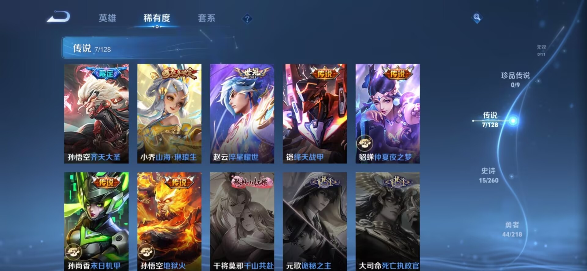- [12287220]V10 2典藏 1珍品无双 2无双 1珍品传说 37传说 125英雄 398皮肤 可修改实名 优质装备:馥梦繁花,鸣剑·曳影,全息碎影(猴子典藏),韩信群星魔术团(韩信无双),天机白泽,朽木白哉,黄金狮子座,黄金射手座,冠军飞将,云鹰飞将(小将军),黄金白羊座,猫影幻舞,久胜战神,炽阳神光,一念神魔,云霓雀翎,末日机甲-孙尚香(绿蚂蚱),仲夏夜之梦(大飞蛾),地狱之眼,胖达荣荣,时之恋人-刘备(电焊工),游龙清影(小青龙),淬星耀世,超时空战士-狄仁杰,花朝如约(花篮子),无双飞将,浮生妄,霜月吟,澜逐花归海,艾琳觅芳踪,千山共赴,涂山容容 传说皮:落雪白狼,九山相柳 珍宝阁皮:蔷薇恋人,女武神 限定皮:白虎志(电光耗子),凤求凰(白切鸡),异界灵契(白毛香),傲雪梅枪,寅虎·展翼(孙膑年限),绯月行,时之彼端,白鹤梁神女,时雨天司(水龙头),神威(电光马子),飞衡(韩信年限),遇见飞天,高山流水,怒海麟威,五谷丰年,冰锋战神,游园惊梦,梁祝,御风骁将(吕布年限),天狼狩猎者,逐梦之星,逐梦之音,天狼征服者,奔雷神使(牛魔年限),祈雪灵祝(雪兔子),李小龙,逐梦之影,玄武志(苏烈年限),朱雀志(守约年限),猪悟能,引擎之心,青春决赛季,冰霜恋舞曲,神奇女侠,美猴王,寅虎·赤拳(老虎年限),百木心枪,枫霜尽 史诗皮:赞萌露比,灵蛊蚀心,鸭鸭历险记-刘禅,龙之律动,小牛鸭,石田雨龙,百相守梦-周瑜,幻珠鲛人,守夜人,百相守梦-黄忠,织梦人,紫霞仙子,苍穹之光,电玩小子(小书包),黄金分割率,特工魅影,千年之狐,江河有灵,蒙恬荣光圣徽,晚萤,魅语,无限星赏官,冰冠公主,偶像歌手,电玩·爆裂旋风,银翎春语,末日机甲-吕布,猫狗日记-孙策,猫狗日记-大乔,时之恋人-孙尚香,乱世虎臣,节奏热浪,修罗,女仆咖啡,摇滚巨星,水果甜心,绅士熊喵,天才门将,星夜王子,心灵骇客,时之奇旅-安琪拉,功夫厨神,德古拉伯爵,暗隐猎兽者,幽灵船长,鬼剑武藏,心灵战警,乐园奇幻夜,舞动绿茵,地狱岩魂,纤云弄巧,繁星吟游(呼啦呼啦),拒霜思,缤纷独角兽,乘风破浪,逐浪之夏,水晶猎龙者,曙光守护者,热力回旋,箭羽风息,金属风暴,原初追逐者,圣诞狂欢,圣诞恋歌,鹰眼统帅,暗夜贵公子,魅力维加斯,黎明之约,赏金猎手,无心,未来纪元-赵云