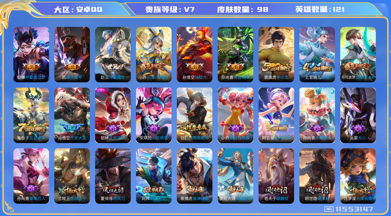 [11553147]V7 7传说 121英雄 98皮肤 可修改实名 优质装备:绛天战甲(鸡嘴战神),末日机甲-孙尚香(绿蚂蚱),地狱火,仲夏夜之梦(大飞蛾),淬星耀世,山海·琳琅生(小乔年限) 珍宝阁皮:蔷薇恋人 限定皮:齐天大圣,五谷丰年,梁祝,李小龙,山海·玄木吟(马可年限) 史诗皮:江河有灵,水果甜心,心灵骇客,缤纷独角兽,圣诞恋歌,鹰眼统帅,无心