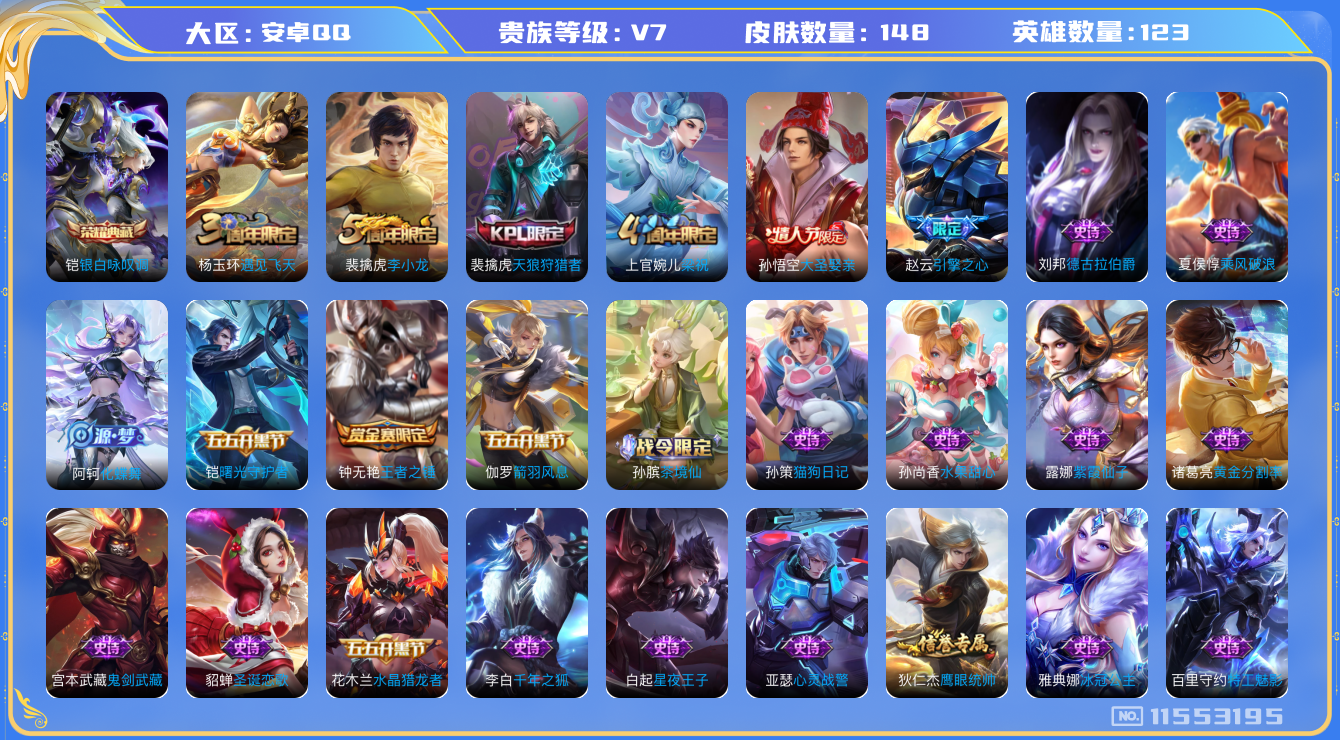 [11553195]V7 1典藏 123英雄 148皮肤 可修改实名 优质装备:银白咏叹调(倪克斯侍卫) 限定皮:遇见飞天,梁祝,天狼狩猎者,李小龙,大圣娶亲,引擎之心 史诗皮:化蝶舞,茶境仙,紫霞仙子,黄金分割率,特工魅影,千年之狐,冰冠公主,偶像歌手,猫狗日记-孙策,女仆咖啡,水果甜心,星夜王子,德古拉伯爵,鬼剑武藏,心灵战警,舞动绿茵,乘风破浪,水晶猎龙者,曙光守护者,箭羽风息,圣诞恋歌,鹰眼统帅,王者之锤