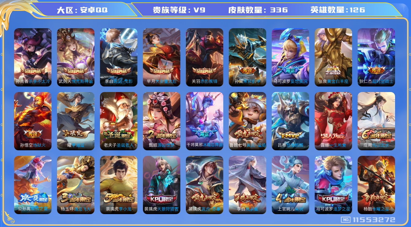 [11553272]V9 5典藏 16传说 126英雄 336皮肤 典藏英雄武则天 可修改实名 优质装备:倪克斯神谕(宇宙婆娘),杀手不太冷,大秦宣太后,鸣剑·曳影,赤影疾锋,黄金白羊座,地狱火,李逍遥,超时空战士-狄仁杰,末日机甲-孙策,妄想实况 珍宝阁皮:优雅恋人,女武神,玩趣恶龙 限定皮:愿照·九州拓(澜年限),愿照·千秋盛(女娲年限),白虎志(电光耗子),凤求凰(白切鸡),凤凰于飞,飞衡(韩信年限),遇见飞天,高山流水,怒海麟威,五谷丰年,冰锋战神,武圣,游园惊梦,梁祝,天狼狩猎者,逐梦之星,李小龙,永曜之星,圣诞老人,奇迹圣诞,一生所爱,大圣娶亲,引擎之心,冰霜恋舞曲,蜜橘之夏,寅虎·瑞焰(虎皮蛋子),寅虎·赤拳(老虎年限),时之祈愿-云中君,山海·玄木吟(马可年限) 史诗皮:器灵·浮梦炉,化蝶舞,灵蛊蚀心,星界战将,百相守梦-黄忠,紫霞仙子,苍穹之光,白龙吟,黄金分割率,特工魅影,千年之狐,永昼,江河有灵,魅语,百解令(蒙犽),蒙恬荣光圣徽,无限星赏官,冰冠公主,偶像歌手,晚萤,暗夜猫娘,龙骑士(小龙虾),末日机甲-吕布,猫狗日记-孙策,猫狗日记-大乔,乱世虎臣,节奏热浪,修罗,女仆咖啡,摇滚巨星,水果甜心,绅士熊喵,天才门将,星夜王子,心灵骇客,功夫厨神,德古拉伯爵,暗隐猎兽者,幽灵船长,鬼剑武藏,暗渊魔法,心灵战警,天秀·启明,舞动绿茵,地狱岩魂,纤云弄巧,缤纷独角兽,乘风破浪,逐浪之夏,月团寄思,水晶猎龙者,曙光守护者,热力回旋,箭羽风息,金属风暴,原初追逐者,圣诞狂欢,圣诞恋歌,鹰眼统帅,暗夜贵公子,魅力维加斯,无心,未来纪元-赵云