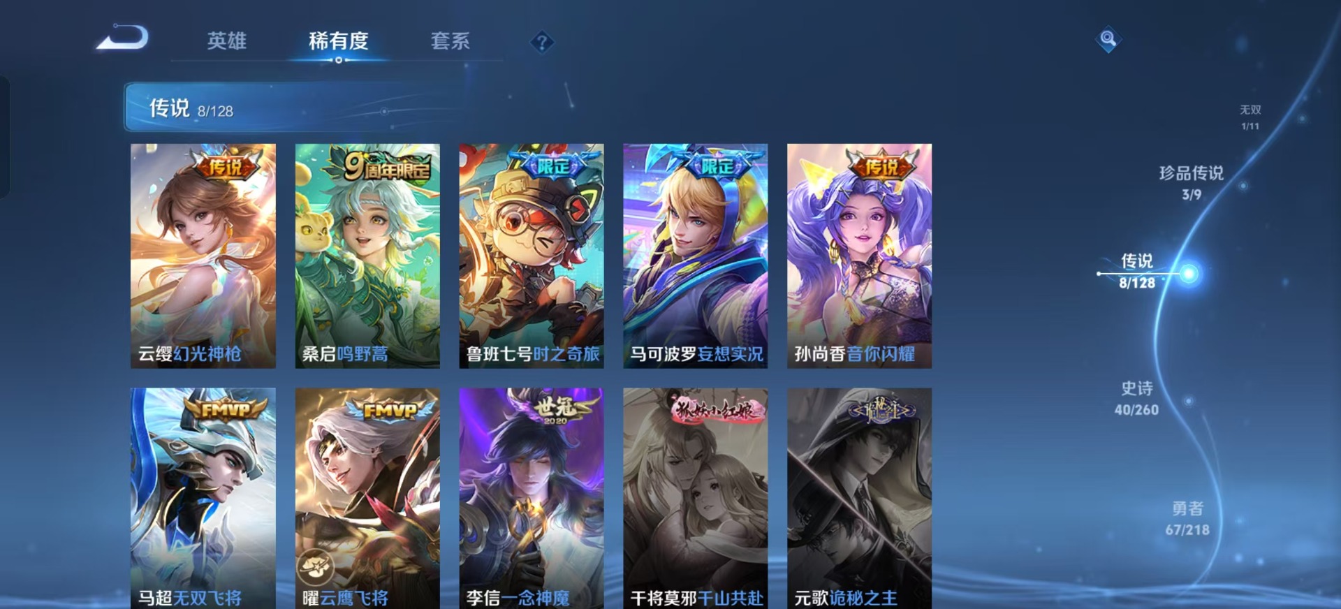 - [11972353]V7 9传说 124英雄 212皮肤 可修改实名 优质装备:炽阳神光,地狱火,仲夏夜之梦(大飞蛾),零号·赤焰 珍宝阁皮:蔷薇恋人,玩趣恶龙 限定皮:愿照·九州拓(澜年限),鸣野蒿,至尊宝,白虎志(电光耗子),凤求凰(白切鸡),时雨天司(水龙头),飞衡(韩信年限),五谷丰年,游园惊梦,梁祝,李小龙,大圣娶亲 史诗皮:化蝶舞,百相守梦-黄忠,紫霞仙子,电玩小子(小书包),白龙吟,黄金分割率,特工魅影,千年之狐,江河有灵,魅语,百解令(蒙犽),无限星赏官,偶像歌手,龙骑士(小龙虾),末日机甲-吕布,时之恋人-孙尚香,节奏热浪,女仆咖啡,水果甜心,绅士熊喵,天才门将,星夜王子,德古拉伯爵,暗隐猎兽者,幽灵船长,鬼剑武藏,纤云弄巧,繁星吟游(呼啦呼啦),缤纷独角兽,逐浪之夏,水晶猎龙者,曙光守护者,金属风暴,原初追逐者,圣诞恋歌,鹰眼统帅,魅力维加斯,赏金猎手,无心,未来纪元-赵云