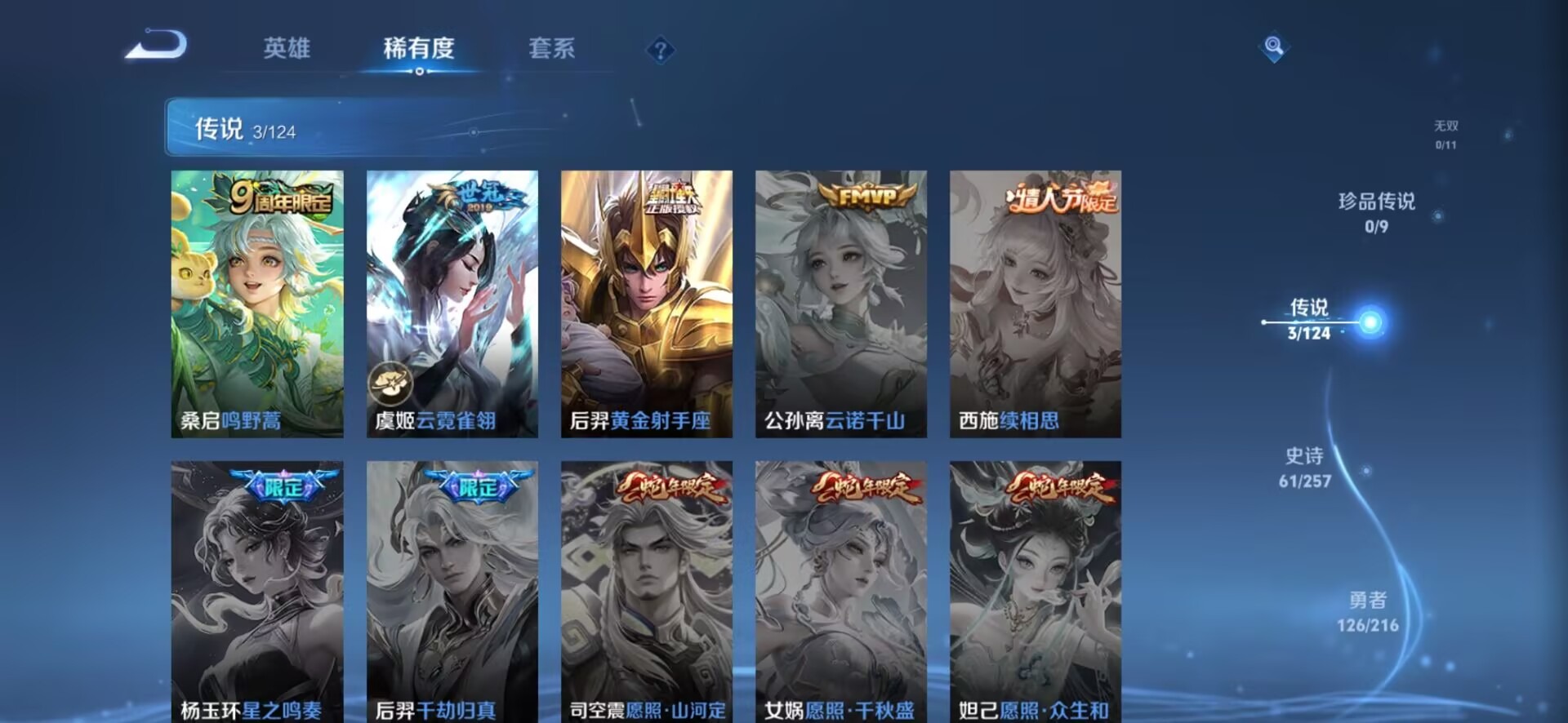 - PX_2081174-贵族等级: V4 英雄数: 121 皮肤数: 158 传说皮: 无双飞将,山海·炽霜斩,山海·苍雷引,幻光神枪 限定皮: 梁祝,引擎之心,飞衡,天狼狩猎者,孙行者,五谷丰年,诗剑行,山海·玄木吟,鸣野蒿,愿照·九州拓