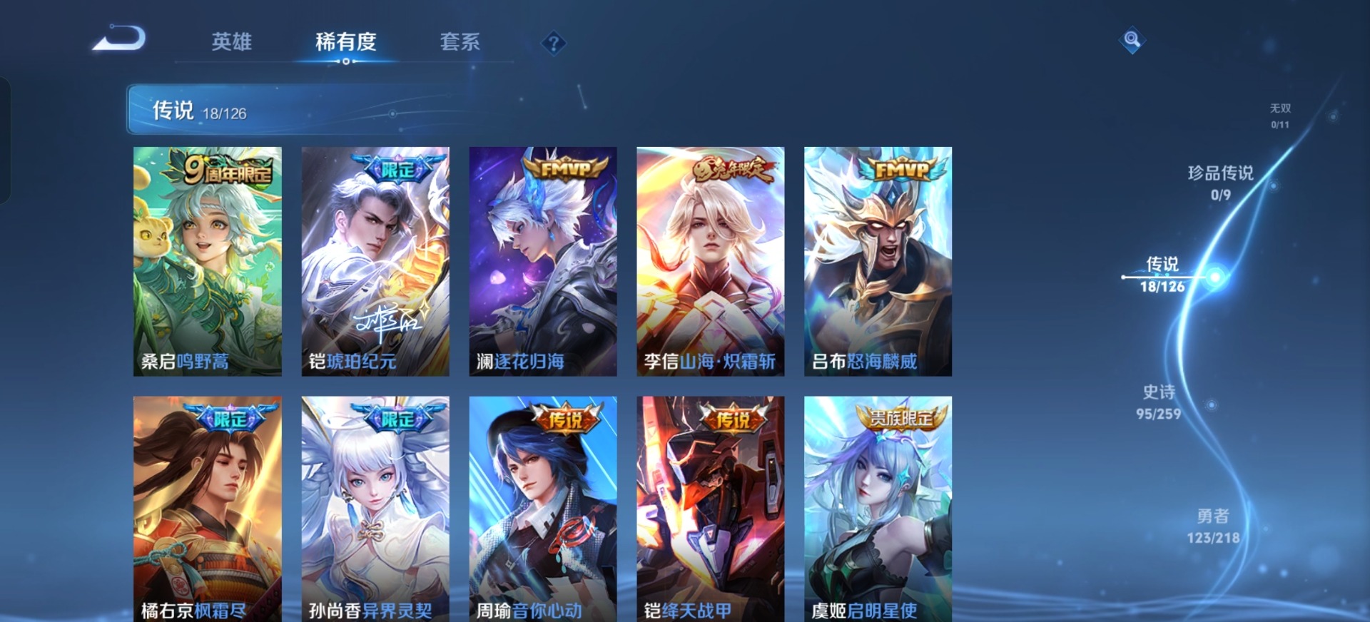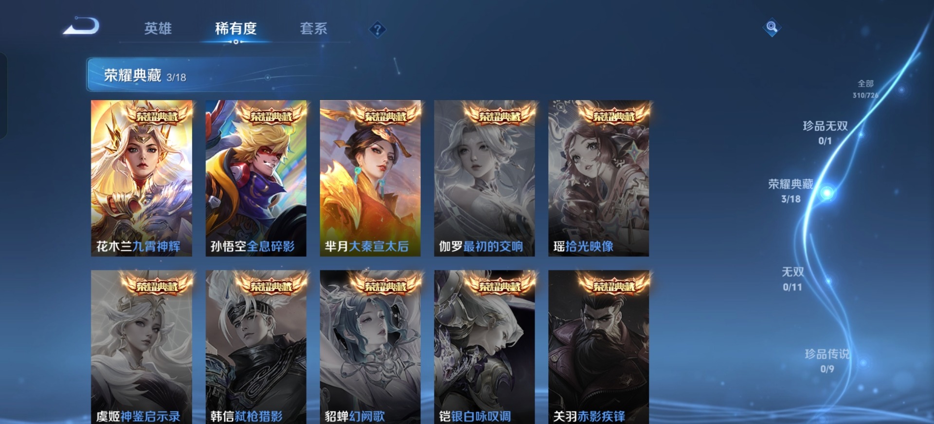 铠青龙志,典韦岱宗,孙尚香异界灵契,吕布御风骁将,裴擒虎李小龙,上官婉儿梁祝,花木兰默契交锋,花木兰瑞麟志,马可波罗山海·玄木吟,桑启鸣野蒿,猪八戒猪悟能,孙悟空孙行者,芈月白晶晶,韩信飞衡,橘右京枫霜尽