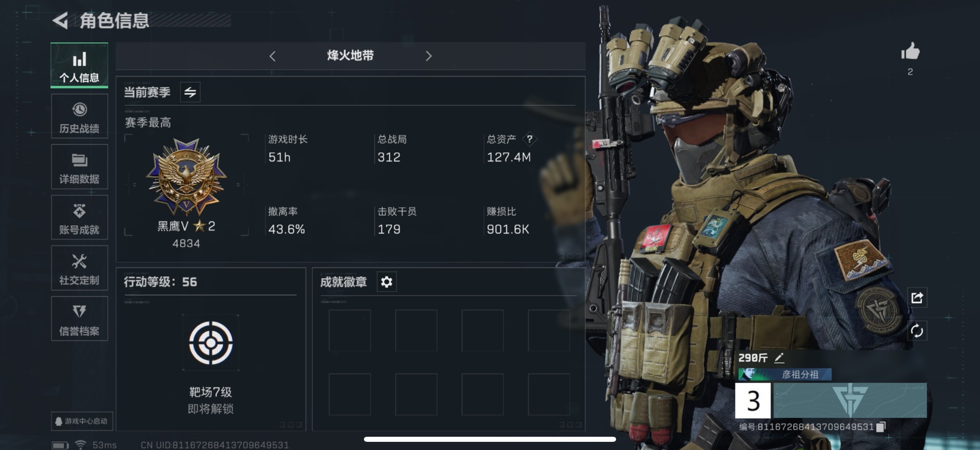 [11553523]总资产:127.4M 7传说枪械 哈夫币:101K 可二次 可修改实名 烽火地带段位:黑鹰 全面战场段位:无段位 传说武器皮肤:SMG45冲锋枪-骑士,AK-12突击步枪-特斯拉线圈,CAR-15突击步枪-阿米娅,SR-3M紧凑突击步枪-特斯拉线圈,UZI冲锋枪-特斯拉线圈,勇士冲锋枪-能天使-午夜邮差,Vector冲锋枪-能天使-午夜邮差 史诗武器皮肤:AUG突击步枪-蝮蛇,M16A4突击步枪-竞赛选手,M1014霰弹枪-林中猎手,MP5冲锋枪-深海恐惧,AKM突击步枪-林中猎手,SV-98狙击步枪-林中猎手