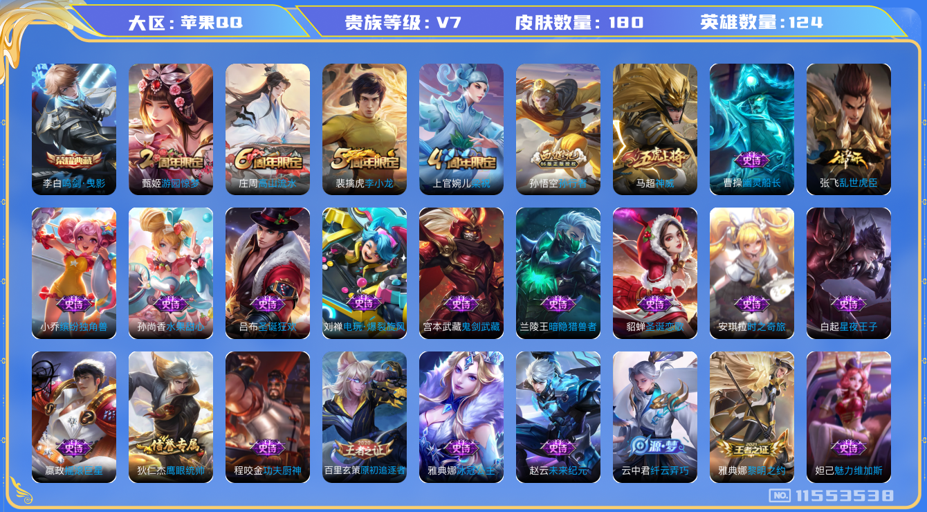 - [11678466]V7 10传说 124英雄 245皮肤 可修改实名 优质装备:黄金狮子座,云鹰飞将(小将军),猫影幻舞,久胜战神,一念神魔,末日机甲-孙尚香(绿蚂蚱),超时空战士-狄仁杰 传说皮:幻光神枪 珍宝阁皮:妄想食味,优雅恋人 限定皮:逐霄战戟,鸣野蒿,至尊宝,白虎志(电光耗子),梅西,神威(电光马子),高山流水,冰锋战神,梁祝,天狼狩猎者,天狼绘梦者,李小龙,朱雀志(守约年限),霸王别姬-虞姬,大圣娶亲 史诗皮:化蝶舞,星界战将,谪仙醉月,龙之律动,百相守梦-黄忠,紫霞仙子,黄金分割率,特工魅影,千年之狐,江河有灵,蒙恬荣光圣徽,偶像歌手,末日机甲-吕布,猫狗日记-孙策,猫狗日记-大乔,乱世虎臣,节奏热浪,修罗,水果甜心,星夜王子,功夫厨神,德古拉伯爵,暗隐猎兽者,幽灵船长,鬼剑武藏,心灵战警,舞动绿茵,纤云弄巧,繁星吟游(呼啦呼啦),缤纷独角兽,乘风破浪,逐浪之夏,水晶猎龙者,金属风暴,原初追逐者,圣诞狂欢,圣诞恋歌,鹰眼统帅,王者之锤,魅力维加斯,黎明之约,无心