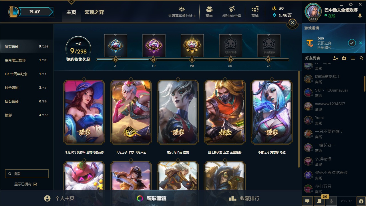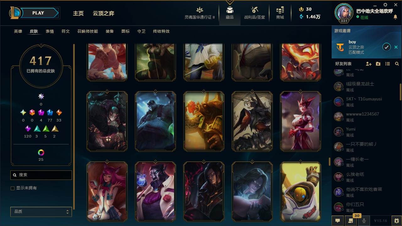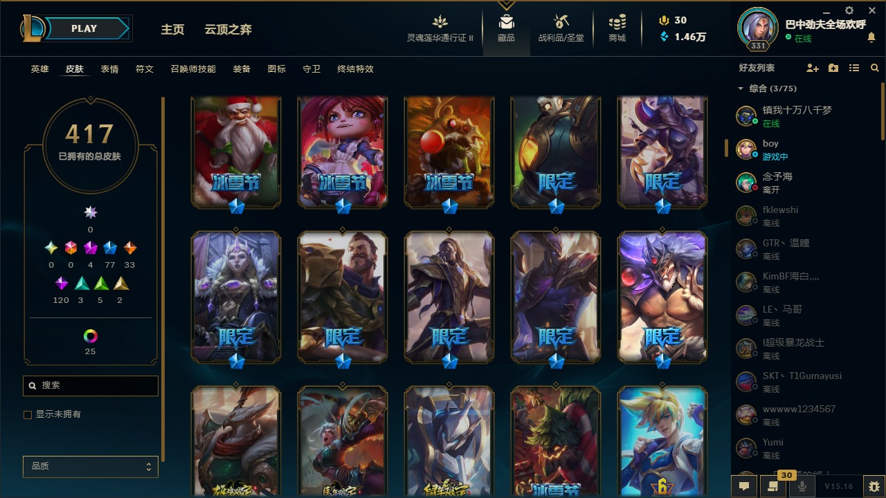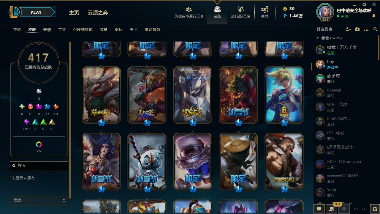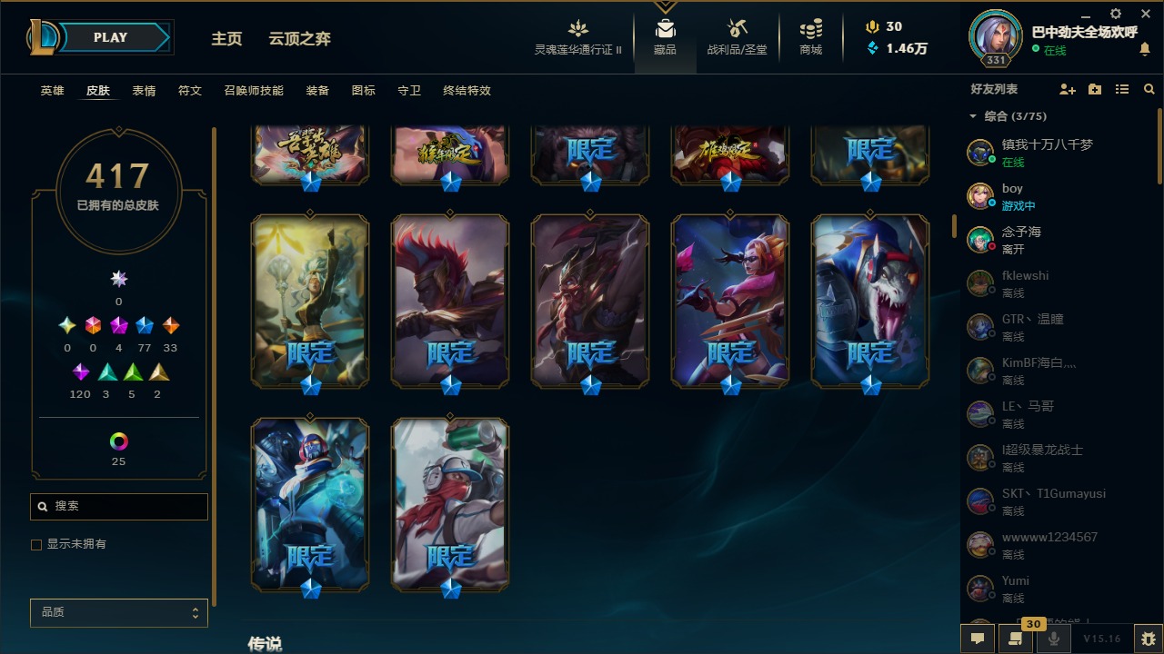 [11553547]可二次 可修改实名 4神话 8臻彩 77限定 33传说 120史诗 417皮肤 41炫彩 171英雄 铂金 皮肤:至臻 神龙尊者 炎龙瑟提,王国机神苍狼 瑟提,太空律动 “创乐之神” 奥恩,雷霆领主 奥恩,晨星之翎 洛,冰雪游神 巴德,腥红之月 卡莉丝塔,灌篮高手 艾翁,糖果之王 艾翁,上古战魂 雷克塞,虚空使者 俄洛伊,腥红之月 锤石,冠军典狱长 锤石,司马懿 仲达,星际之门 阿兹尔,海皇姬 娜美,鲛妮座人 娜美,胜利之剑 亚托克斯,仲裁圣骑 亚托克斯,源计划:裁决 蔚,虎痴之拳 蔚,霓虹杀拳 蔚,SKT T1 艾克,任性学霸 艾克,爵士 克烈,胜利枪神 卢锡安,纳财大帝 塔姆,海牛大大 塔姆,星之守护者 金克丝,神龙烈焰 金克丝,黯焰双魂 千珏,腥红之月 烬,西部牛仔 烬,糖果大战 布隆,布隆·狮心,猛虎 布隆,屠龙勇士 布隆,源代码 卡蜜尔,弗雷尔卓德 塔莉垭,这货不是维克兹,苍穹之光 维克兹,战地机甲 维克兹,源计划:风 亚索,西部牛仔 亚索,邪恶魔人 扎克,狂狮 纳尔,萌侦探 喵尔摩斯,最后一只恐龙 纳尔,魔女 婕拉,驯龙女巫 婕拉,SKT T1 婕拉,鬼影森森 婕拉,野火之藤 婕拉