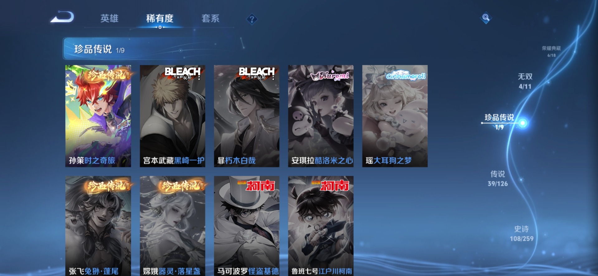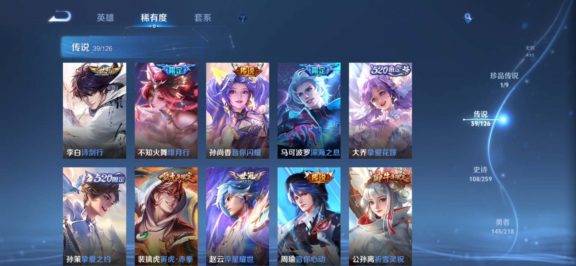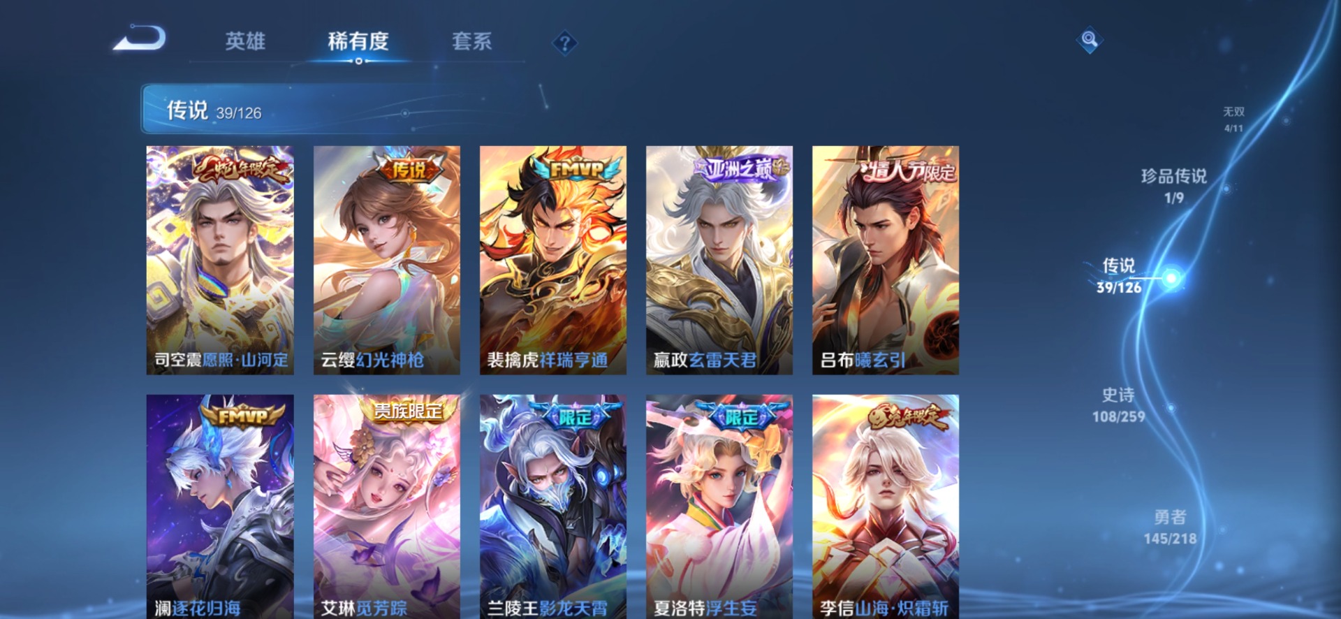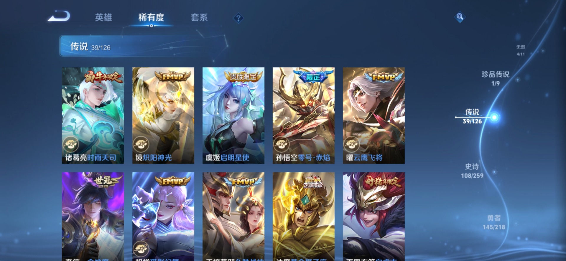 - PX_2068347-贵族等级: V7 英雄数: 123 皮肤数: 191 传说皮: 云鹰飞将,一念神魔,地狱火,山海·炽霜斩 限定皮: 李小龙,梁祝,神威,天狼绘梦者,大圣娶亲,傲雪梅枪,时之祈愿-瑶,山海·玄木吟