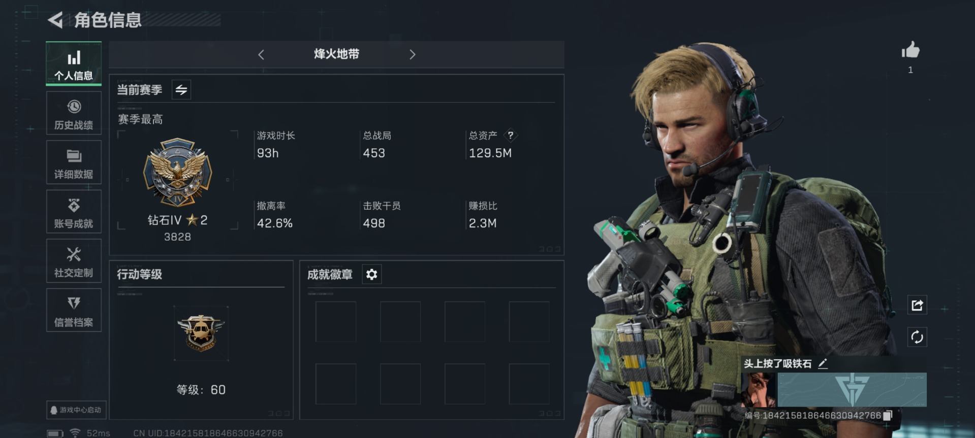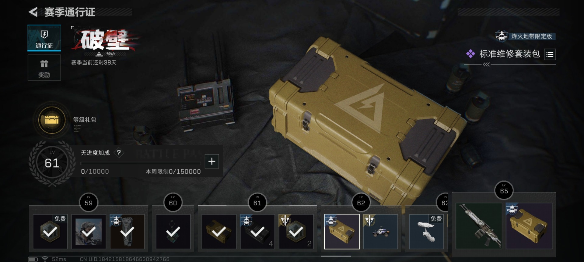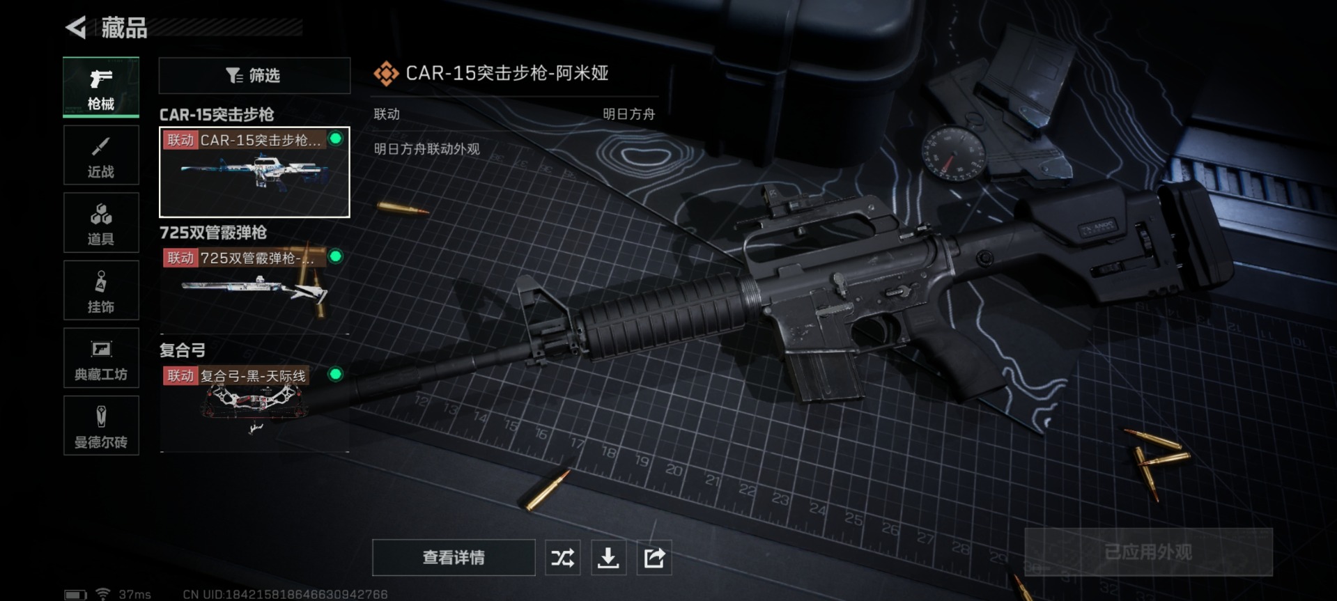[11553563]总资产:129.5 1干员外观 3传说枪械 高级安全箱(9.17到期) 可二次 可修改实名 烽火地带段位:钻石 全面战场段位:无段位 哈夫币:9.672 传说武器皮肤:复合弓-黑-天际线,CAR-15突击步枪-阿米娅,725双管霰弹枪-送葬人-无题密令 史诗武器皮肤:PKM通用机枪-荒野求生,SV-98狙击步枪-林中猎手,PSG-1射手步枪-无垢,M250通用机枪-囚徒,SV-98狙击步枪-囚徒,SVD狙击步枪-阿萨拉工艺 干员外观:露娜-黑·天际线