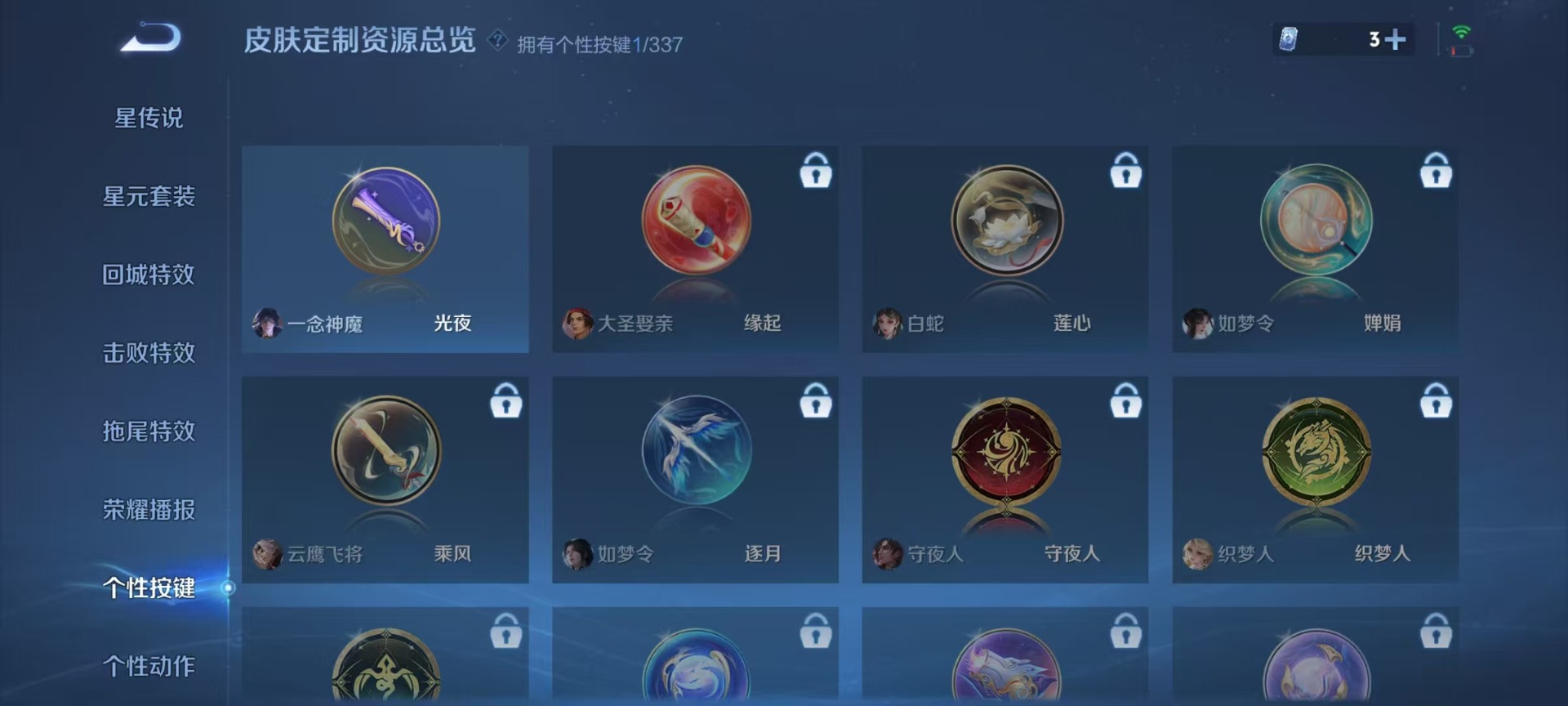 宫本武藏鬼剑武藏,兰陵王暗隐猎兽者,刘邦德古拉伯爵,夏侯惇乘风破浪,花木兰水晶猎龙者,蒙犽百解令,杨戬天秀·启明,刘备百相守梦,白起星夜王子,程咬金功夫厨神,百里玄策热力回旋,李元芳逐浪之夏,吕布圣诞狂欢,诸葛亮黄金分割率,刘禅电玩·爆裂旋风,司马懿暗渊魔法,嫦娥拒霜思,刘禅天才门将