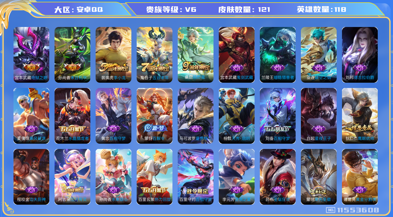 [11553608]V6 3传说 118英雄 121皮肤 可修改实名 优质装备:末日机甲-孙尚香(绿蚂蚱),地狱之眼 珍宝阁皮:妄想食味,玩趣恶龙 限定皮:鸣野蒿,五谷丰年,李小龙 史诗皮:星界特工,破空之剑,百相守梦-百里守约,百相守梦-黄忠,黄金分割率,百相守梦(刘备),电玩·爆裂旋风,江河有灵,百解令(蒙犽),蒙恬荣光圣徽,水果甜心,天才门将,星夜王子,功夫厨神,德古拉伯爵,暗隐猎兽者,鬼剑武藏,暗渊魔法,天秀·启明,拒霜思,乘风破浪,逐浪之夏,水晶猎龙者,热力回旋,圣诞狂欢,鹰眼统帅,无心