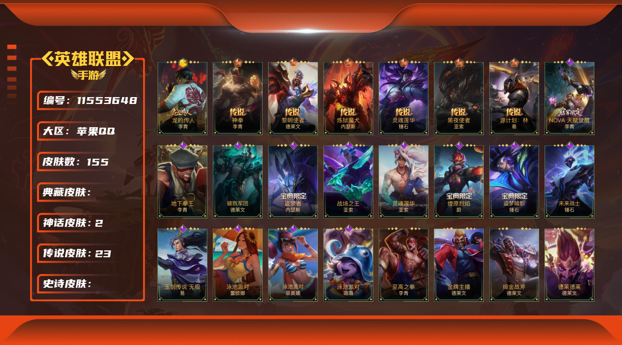 [11553648]可二次 可修改实名 2神话 23传说 58史诗 155皮肤 125英雄 铂金 皮肤:李青-神拳,李青-NOVA 天赋觉醒,李青-至高之拳,李青-龙的传人,李青-地下拳王,德莱文-破败军团,德莱文-黎明使者,德莱文-金牌主播,德莱文-绯金战斧,德莱文-德莱德莱,内瑟斯-炼狱魔犬,内瑟斯-单身贵族,内瑟斯-盗梦者,内瑟斯-创世魔神,亚索-战场之王,亚索-灵魂莲华,亚索-黑夜使者,亚索-西部牛仔,蔚-女警官,蔚-铁拳执事,蔚-燎原烈焰,蔚-双城之战,锤石-盗梦暗影,锤石-灵魂莲华,锤石-未来战士,易-源计划:林,易-玉剑传说 无极,璐璐-泳池派对,璐璐-邪恶女巫,璐璐-光耀之灵,安妮-小红帽,安妮-银河魔装机神,安妮-冰霜烈焰,金克丝-末路狂花,金克丝-光耀之芒,金克丝-双城之战,奥拉夫-王牌勇将,奥拉夫-黑暗骑士,奥拉夫-铁哥们儿,菲奥娜-绯金丽刃,菲奥娜-泳池派对,菲奥娜-福牛守护者,蕾欧娜-月蚀骑士,蕾欧娜-泳池派对