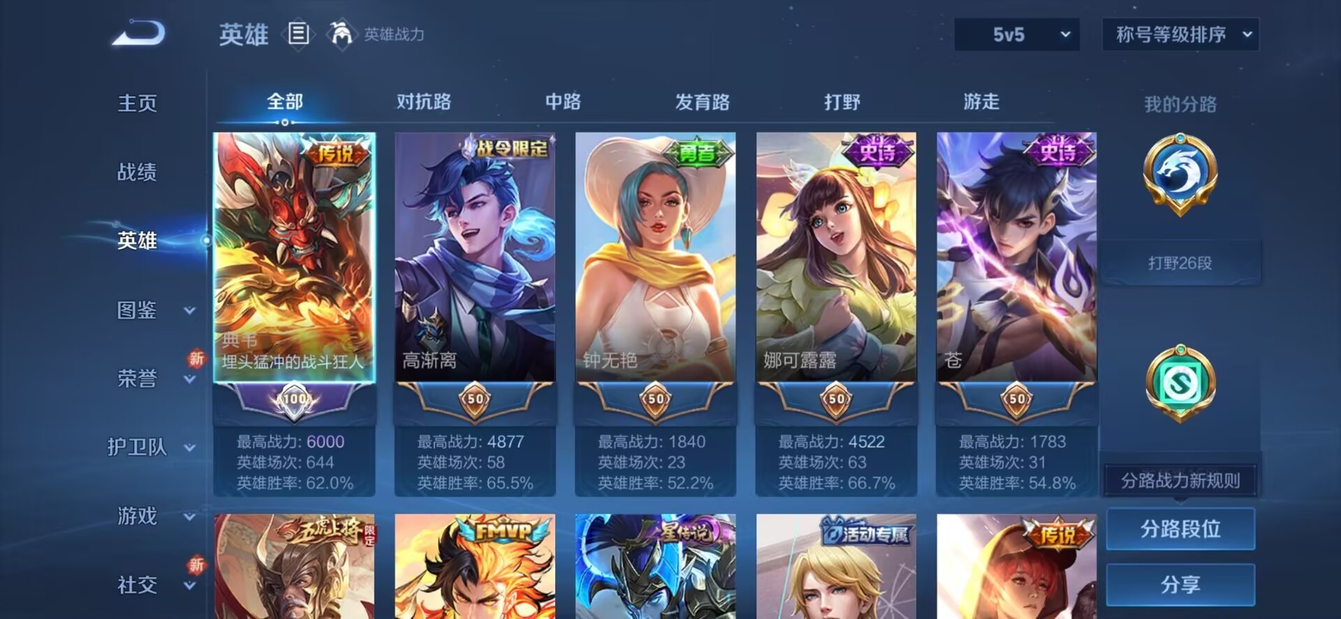 - PX_2025694-贵族等级: V8 英雄数: 124 皮肤数: 292 荣耀水晶: 九霄神辉,赤影疾锋 珍品传说: 怪盗基德,器灵·落星盏 传说皮: 云鹰飞将,黄金白羊座,久胜战神,一念神魔,地狱火,仲夏夜之梦,游龙清影,末日机甲-孙策,碎云,山海·炽霜斩,炽翼辉光,乘龙·问璇玑,乘龙·淬吴钩,典韦战鼓燎原 限定皮: 梁祝,时雨天司,辉光之辰,孙行者,时之奇旅-妲己,星穹之声,五谷丰年,降魔,