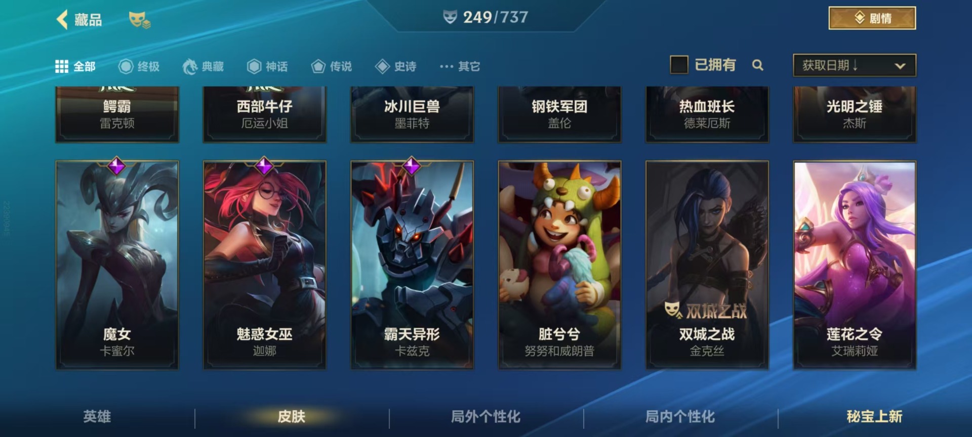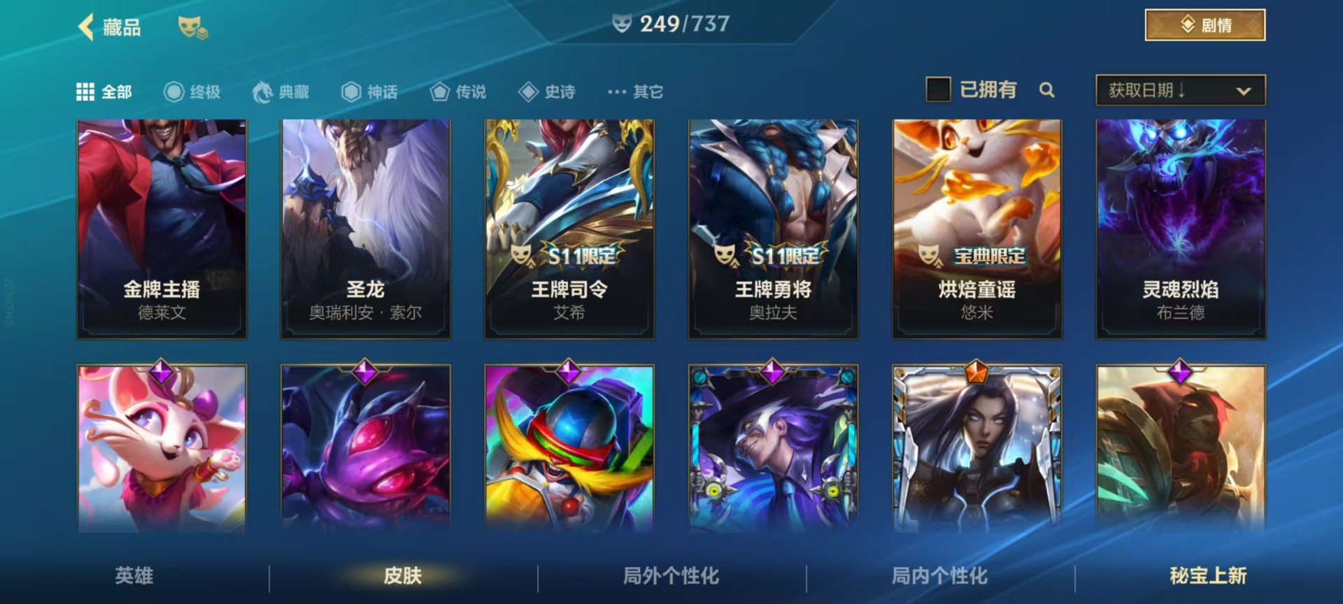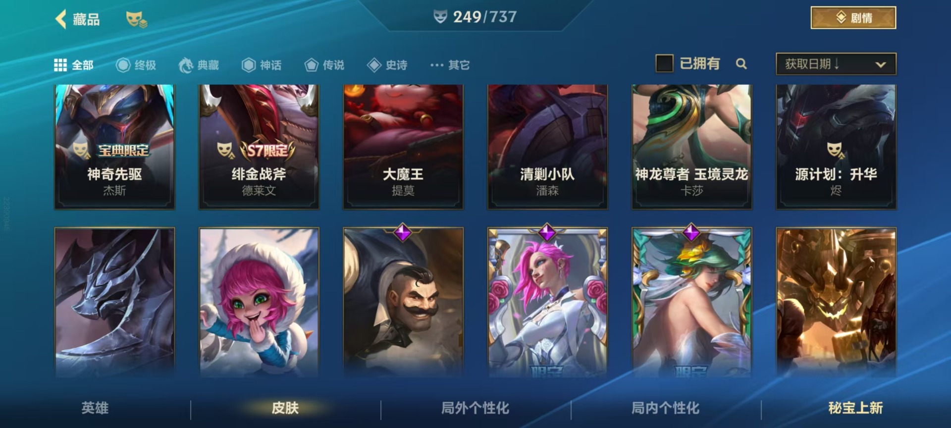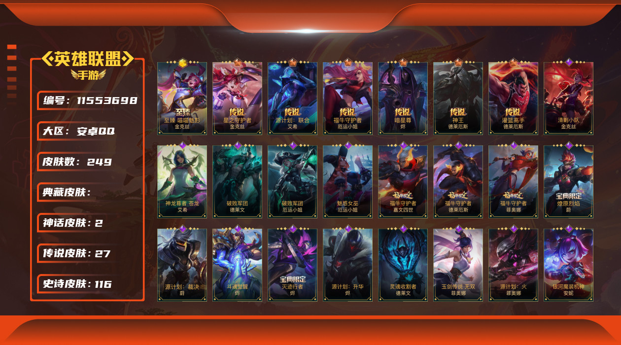 [11553698]可二次 可修改实名 2神话 27传说 116史诗 249皮肤 128英雄 翡翠 皮肤:金克丝-双城之战,金克丝-至臻 喵喵魅影,金克丝-光耀之芒,金克丝-清剿小队,金克丝-神龙烈焰,金克丝-末路狂花,金克丝-星之守护者,艾希-王牌司令,艾希-神龙尊者 苍龙,艾希-黑暗骑士,艾希-女皇,艾希-极地女神,艾希-源计划:联合,厄运小姐-抵抗军战姬,厄运小姐-破败军团,厄运小姐-魅惑女巫,厄运小姐-福牛守护者,厄运小姐-西部牛仔,蔚-双城之战,蔚-燎原烈焰,蔚-女警官,蔚-水晶玫瑰,蔚-源计划:裁决,烬-斗魂觉醒,烬-龙冕异士,烬-灭迹行者,烬-暗星尊,烬-源计划:升华,德莱文-绯金战斧,德莱文-破败军团,德莱文-德莱德莱,德莱文-灵魂收割者,德莱文-金牌主播,菲奥娜-绯金丽刃,菲奥娜-福牛守护者,菲奥娜-玉剑传说 无双,菲奥娜-皇家守卫,菲奥娜-源计划:火,安妮-“你看见过我的熊猫吗?”,安妮-银河魔装机神,安妮-小红帽,安妮-甜心宝贝,德莱厄斯-福牛守护者,德莱厄斯-西部魔影,德莱厄斯-热血班长,德莱厄斯-神王,德莱厄斯-灌篮高手,嘉文四世-王牌上将,嘉文四世-福牛守护者,嘉文四世-水晶玫瑰,嘉文四世-暗星,嘉文四世-孤胆英豪