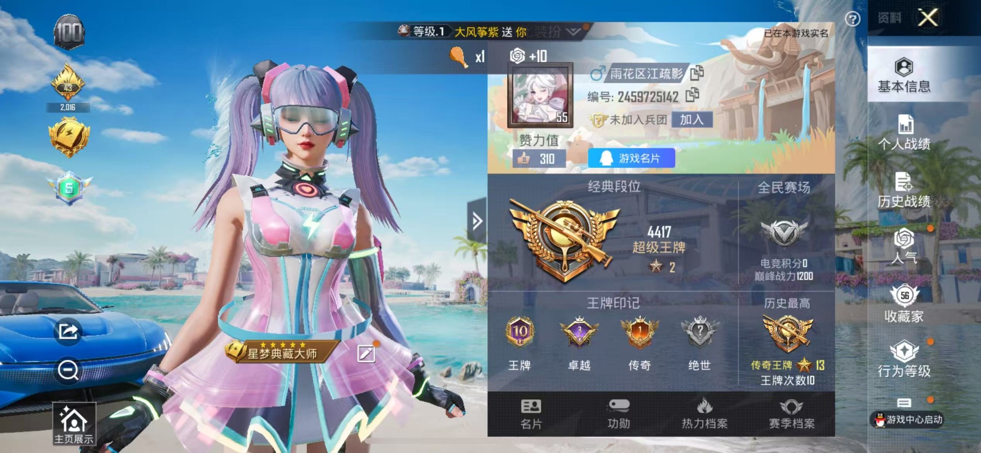 - PX_2102251-安卓QQ 历史总热力值:50585 粉装数量:7 特效枪数量:5 载具数量:1 王牌印记:7 历史最高段位:超级王牌10星 套装数量:105 时装数量:415 枪械数量:160 战备数量:112 装备数量:144 载具:宾利BATUR(极速紫) 时装:套装-傲傲奶龙,套装-憨憨奶龙,套装-暖暖奶龙,套装-缤纷油彩,套装-莲影清波,角色-呆萌星弥,角色-小可学妹,套装-SS15