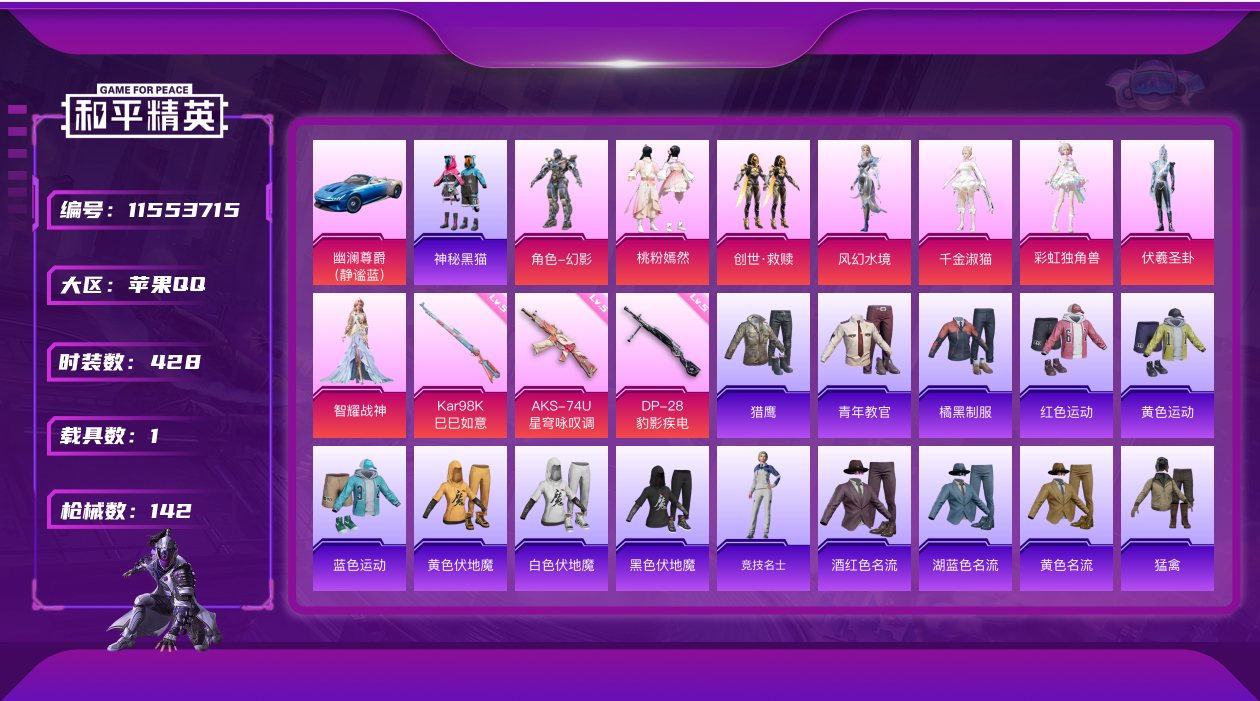 [11553715]8粉装 3特效枪 1载具 10印记 可二次 可修改实名 设备脸 优质装备:幽澜尊爵(静谧蓝),千金淑猫,伏羲圣卦,彩虹独角兽,桃粉嫣然,智耀战神,AKS-74U-星穹咏叹调,Kar98K-巳巳如意 热门装扮:幻影,创世·救赎,风幻水境,神秘黑猫 稀有枪皮:DP-28-豹影疾电 五级特效枪:五级Kar98K-巳巳如意,五级DP-28-豹影疾电,五级AKS-74U-星穹咏叹调 紫色装扮:SS31特训套装,人气偶像,冷焰舞者,霓虹热舞,SS30特训套装,云朵鹅,雪绒豹,SS33特训套装,顶瓜瓜,豚鼠丹丹,竞技角斗士,吉莉礼服,都市魅力,酒红色名流,酷潮明星,酷萌兔限定,长空猛禽,霓虹街区,青年教官,缤纷果语,蓝彩潮人,蓝色运动,街头潮人,魅力单车,鹤鸣,黄色伏地魔,黄色名流,黄色运动,黎明保卫者,黑色伏地魔,龙的传人,龟仙人,冰河战士,龙魂突击队,蝶变,极速红龙,橘黑制服,涂山之恋,深蓝色名流,幻影武者,坚韧舞者,完美偶像,帅气教官,战地督导,湖蓝色名流,绮丽涂鸦,疯狂小兔子,白色伏地魔,破晓战魂,破蛋小黄鸡,甜蜜告白,空岛之星,竞技达人朋克,红色运动,灰色格斗者,灼焰舞者,猛禽,猎鹰,小熊娃娃,雏菊兔兔,萝兰蝴蝶,SS29特训,先驱飞行员,湖畔霞光,星途旅人,纯真浪花,热情海星,曼妙人鱼,SS28特训,异域银装,石蕴玉辉,鱼渊荷华,玉兔迎春,燕燕于飞,巳巳如意,都市丽猫,青团波波,糖糖葫芦,棉花软糖,竞技名士,果汁能量,惊鸿侠骨,甜梦熊熊,神气柴柴,懵萌河马,SS24特训(SS24特训套装),SS25特训,绝对偶像,锦衣飞扬,焰鹰斗篷,幻羽潜行,SS27特训,无暇誓言,SS26特训,春光漫游,快闪甜心,贝斯之夜,大橘大利,星渊小夜曲,耀粉歌者,粉恋花,蓝冰羽,紫幽梦,SS32特训服(SS32特训套装),萌萌史莱姆,青玉碎影,绯格组合,樱梦幻音,白糯汤圆,糖霜甜心,蜜桃派对,恋语绒绒,光之冒险 优质战备:守护天翼降落伞,拳皇·狂花道降落伞,未来领航者降落伞,英伦信使飞行器,金丰海韵降落伞,恐龙拽拽降落伞,绯穹魔姬降落伞,月影灵韵降落伞,智耀战神降落伞,雪月幻音降落伞,彩虹独角兽飞行器,樱桃泡泡降落伞,彩虹独角兽降落伞,天星战神降落伞,梦幻火箭降落伞,神秘黑猫降落伞,梦之光华降落伞