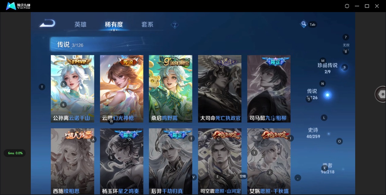 [11553718]V6 1典藏 2珍品传说 3传说 122英雄 176皮肤 可修改实名 优质装备:银白咏叹调(倪克斯侍卫),大耳狗之梦 珍品传说:兔狲·蓬尾 传说皮:云诺千山,幻光神枪 珍宝阁皮:妄想食味,胡桃夹子 限定皮:陌上桑,鸣野蒿,五谷丰年 史诗皮:星界战将,龙之律动,雪豹·霜爪,藏狐·褐绒,石田雨龙,蒙犽顽岩魄,紫霞仙子,电玩·爆裂旋风,江河有灵,百解令(蒙犽),龙骑士(小龙虾),晚萤,冰冠公主,猫狗日记-孙策,节奏热浪,修罗,女仆咖啡,摇滚巨星,水果甜心,绅士熊喵,心灵骇客,幽灵船长,鬼剑武藏,拒霜思,缤纷独角兽,逐浪之夏,水晶猎龙者,箭羽风息,金属风暴,原初追逐者,圣诞恋歌,鹰眼统帅,魅力维加斯,无心