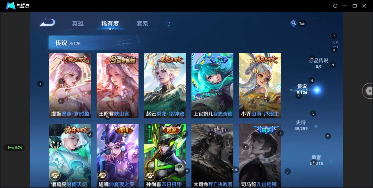 - [11603058]V8 1典藏 1珍品传说 15传说 124英雄 298皮肤 可修改实名 优质装备:鸣剑·曳影,器灵·落星盏,云鹰飞将(小将军),一念神魔,超时空战士-狄仁杰,山海·炽霜斩(李信年限),山海·琳琅生(小乔年限),山海·苍雷引(电光曜子) 珍宝阁皮:优雅恋人,蔷薇恋人,玩趣恶龙 限定皮:愿照·众生和(妲己年限),鸣野蒿,至尊宝,白虎志(电光耗子),傲雪梅枪,寅虎·展翼(孙膑年限),时雨天司(水龙头),神威(电光马子),山海·碧波行(瑶年限),无限倾心-项羽,高山流水,无限倾心-虞姬,五谷丰年,梁祝,御风骁将(吕布年限),李小龙,如梦令-后羿,默契交锋-花木兰,孙行者,猪悟能,大圣娶亲,冰霜恋舞曲,匿光追影者,寅虎·御盾(廉颇年限),寅虎·瑞焰(虎皮蛋子),寅虎·心曲(虎婆),寅虎·赤拳(老虎年限),百木心枪,山海·玄木吟(马可年限) 史诗皮:灵蛊蚀心,紫霞仙子,黄金分割率,特工魅影,千年之狐,江河有灵,高渐离燃音魔法,暗夜猫娘,无限星赏官,冰冠公主,青蛇,末日机甲-吕布,猫狗日记-孙策,猫狗日记-大乔,时之恋人-孙尚香,乱世虎臣,节奏热浪,女仆咖啡,摇滚巨星,水果甜心,绅士熊喵,天才门将,星夜王子,心灵骇客,功夫厨神,德古拉伯爵,暗隐猎兽者,幽灵船长,鬼剑武藏,心灵战警,舞动绿茵,地狱岩魂,纤云弄巧,繁星吟游(呼啦呼啦),拒霜思,缤纷独角兽,乘风破浪,逐浪之夏,水晶猎龙者,曙光守护者,箭羽风息,金属风暴,圣诞狂欢,圣诞恋歌,鹰眼统帅,暗夜贵公子,魅力维加斯,黎明之约,赏金猎手,天秀·音浪,寅虎·御盾,无心,未来纪元-赵云,玫瑰异探
