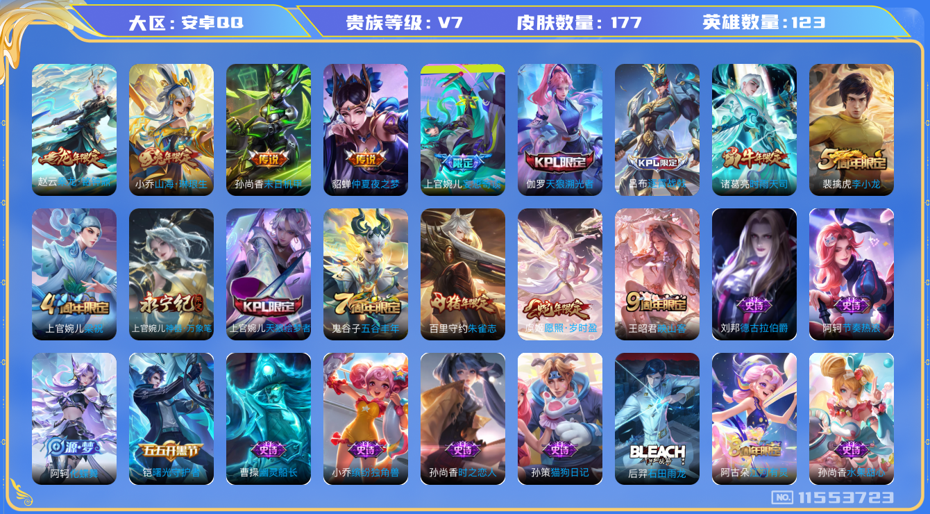 [11553723]V7 8传说 123英雄 177皮肤 可修改实名 优质装备:末日机甲-孙尚香(绿蚂蚱),仲夏夜之梦(大飞蛾),山海·琳琅生(小乔年限),妄想奇谈 传说皮:乘龙·铭钟鼎(赵云年限) 珍宝阁皮:优雅恋人,蔷薇恋人 限定皮:愿照·岁时盈(虞姬年限),逐霄战戟,映山客,时雨天司(水龙头),五谷丰年,梁祝,天狼溯光者,天狼绘梦者,李小龙,朱雀志(守约年限),神器·万象笔 史诗皮:化蝶舞,石田雨龙,上官婉儿群星魔术团,黄金分割率,特工魅影,江河有灵,蒙恬荣光圣徽,魅语,晚萤,猫狗日记-孙策,时之恋人-孙尚香,节奏热浪,女仆咖啡,水果甜心,星夜王子,心灵骇客,德古拉伯爵,幽灵船长,舞动绿茵,缤纷独角兽,水晶猎龙者,曙光守护者,金属风暴,圣诞狂欢,圣诞恋歌,鹰眼统帅,魅力维加斯,黎明之约,无心,未来纪元-赵云