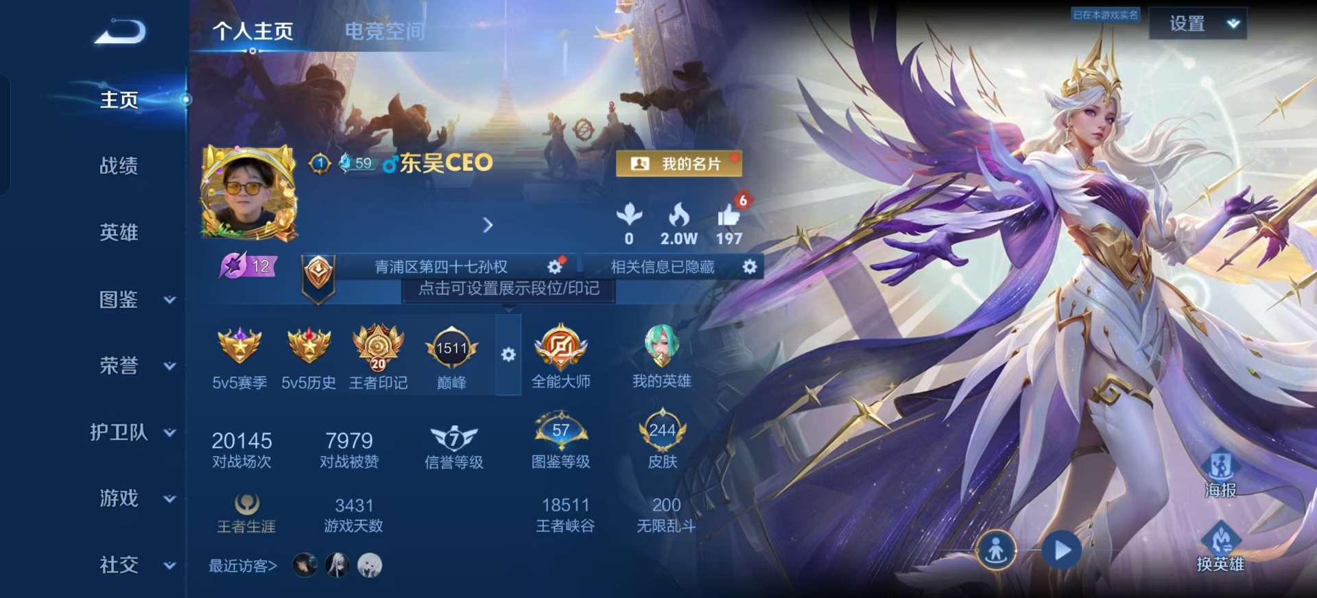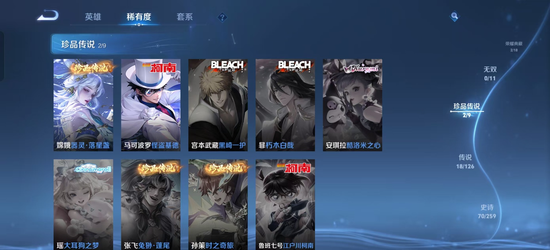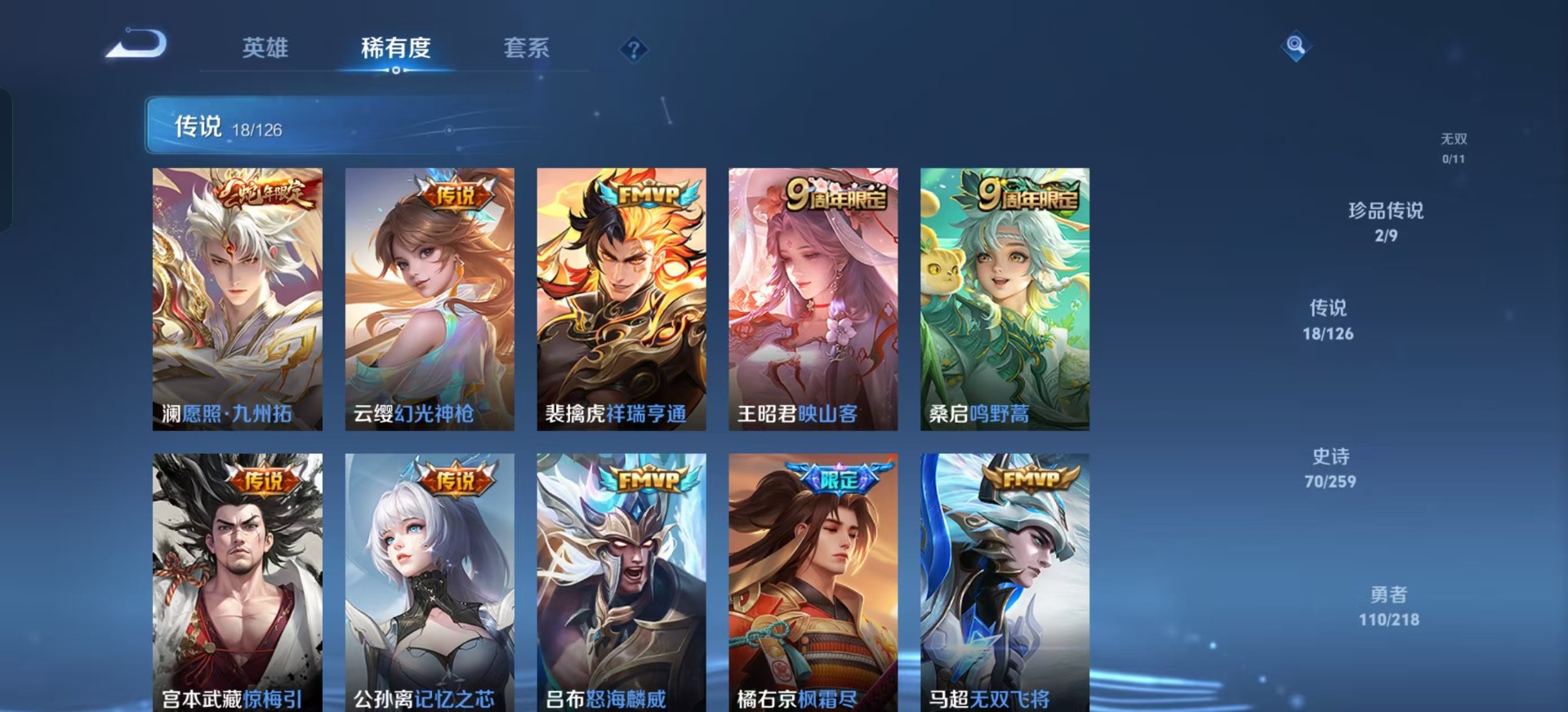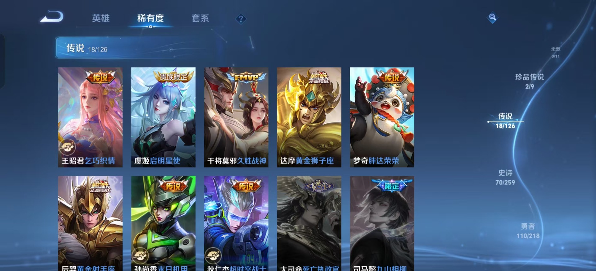 [11553734]实名: 可修改 贵族等级: V8 英雄数: 125 皮肤数: 244 荣耀水晶: 银白咏叹调,神鉴启示录 珍品传说: 怪盗基德,器灵·落星盏 传说皮: 黄金狮子座,黄金射手座,久胜战神,末日机甲-孙尚香,胖达荣荣,乞巧织情,超时空战士-狄仁杰,无双飞将,记忆之芯,惊梅引,幻光神枪,祥瑞亨通 限定皮: 李小龙,游园惊梦,飞衡,大圣娶亲,高山流水,匿光追影者,傲雪梅枪,枫霜尽,五谷丰年,怒海麟威,山海·玄木吟,鸣野蒿,陌上桑,映山客,愿照·九州拓