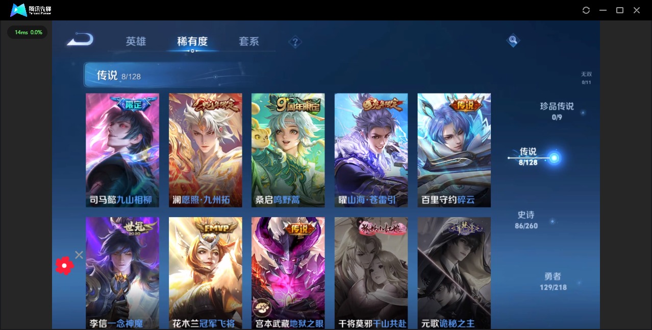 - PX_2094665-62 安卓QQ/至尊星耀/92皮肤/120英雄/0典藏/0珍品无双/0无双/0珍品传说/2传说/20史诗/6稀有英雄 【2 传说皮肤】无限倾心 项羽,至美·化雀舞 甄姬, 【20 史诗皮肤】百解令 蒙犽,雪夜绮愿 周瑜,鬼剑武藏 宫本武藏,地狱燃心 司空震,拒霜思 嫦娥,魅力维加斯 妲己,完美假期 米莱狄,舞动绿茵 蔡文姬,鹰眼统帅 狄仁杰,金属风暴 墨子,匿光侦查者 李元芳