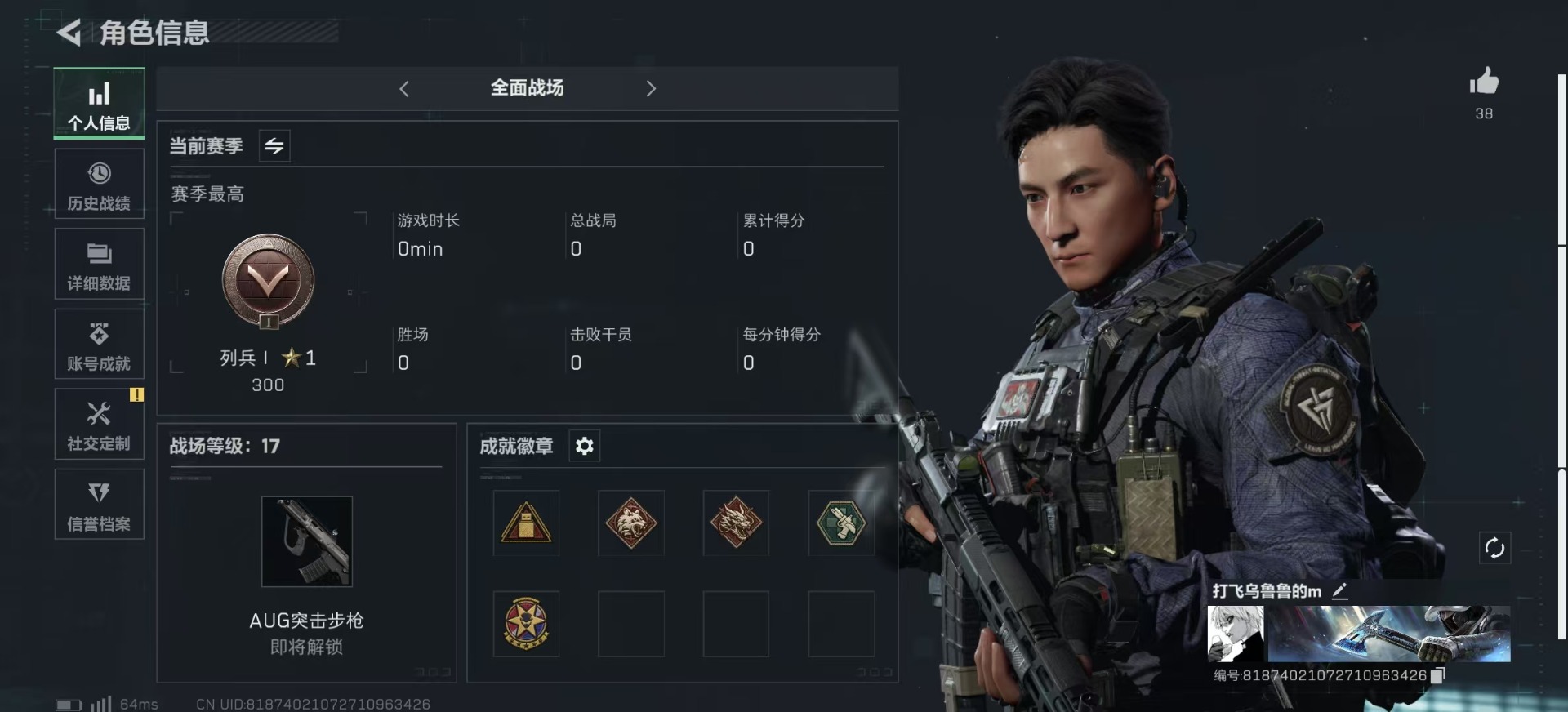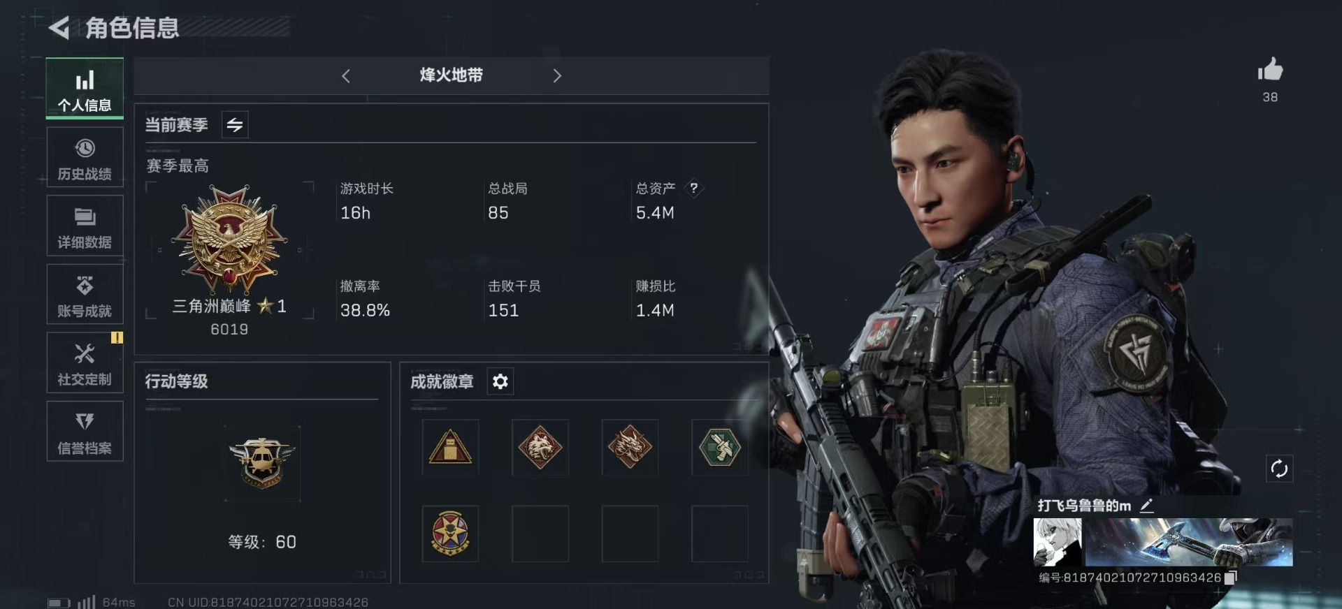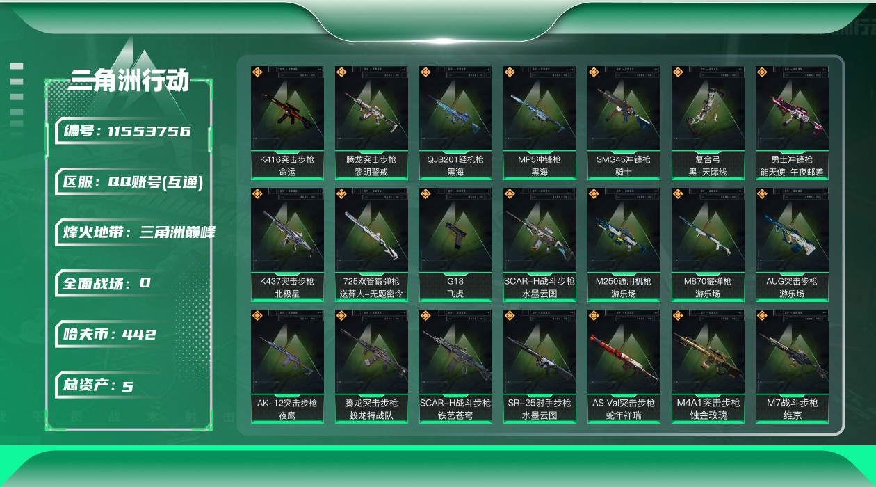 [11553756]总资产:5.4M 4干员外观 22传说枪械 哈夫币:442.079K 可二次 可修改实名 优质装备:K416突击步枪-命运(典藏) 烽火地带段位:三角洲巅峰 全面战场段位:列兵 传说武器皮肤:腾龙突击步枪-蛟龙特战队,AS Val突击步枪-蛇年祥瑞,SR-25射手步枪-水墨云图,SCAR-H战斗步枪-水墨云图,SCAR-H战斗步枪-铁艺苍穹,AK-12突击步枪-夜鹰,G18-飞虎,SMG45冲锋枪-骑士,复合弓-黑-天际线,勇士冲锋枪-能天使-午夜邮差,725双管霰弹枪-送葬人-无题密令,K437突击步枪-北极星,腾龙突击步枪-黎明警戒,MP5冲锋枪-黑海,AUG突击步枪-游乐场,M870霰弹枪-游乐场,M250通用机枪-游乐场,QJB201轻机枪-黑海,M7战斗步枪-维京,M7战斗步枪-怜悯,M4A1突击步枪-蚀金玫瑰 史诗武器皮肤:M700狙击步枪-蝮蛇,SR-25射手步枪-尖端治疗,PKM通用机枪-荒野求生,AS Val突击步枪-尖端治疗,M700狙击步枪-守夜人,SG552突击步枪-尖端治疗,Ash-12战斗步枪-守夜人,MP5冲锋枪-深海恐惧,SR-3M紧凑突击步枪-荒野求生,勇士冲锋枪-深海恐惧,SG552突击步枪-深海恐惧,AKM突击步枪-林中猎手,M16A4突击步枪-竞赛选手,PKM通用机枪-守夜人,SVD狙击步枪-荒野求生,M14射手步枪-禁卫,M1014霰弹枪-林中猎手,SV-98狙击步枪-林中猎手,PSG-1射手步枪-无垢,AS Val突击步枪-典狱官,M250通用机枪-囚徒,SCAR-H战斗步枪-囚徒,腾龙突击步枪-无垢,MP7冲锋枪-无垢,QBZ95-1突击步枪-曙光,沙漠之鹰-曙光,SVD狙击步枪-阿萨拉工艺,PKM通用机枪-英雄,M14射手步枪-黑鹰坠落,M700狙击步枪-竞技风 干员外观:红狼-蚀金玫瑰,骇爪-水墨云图,威龙-飞虎,蜂医-送葬人·无题密令(S5)