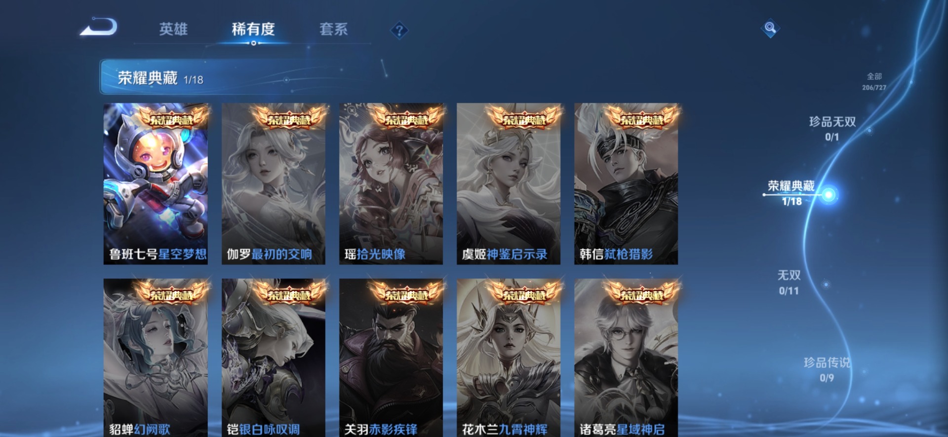 夏侯惇朔风刀,老夫子醍醐杖,沈梦溪大漠名商,盾山御銮,苏烈千军破阵,达摩沙漠行僧,元歌云间偶戏,兰陵王金庭之子,裴擒虎擒涛扼浪,鲁班大师探海日志,明世隐疑决卦,蒙犽狂想玩偶喵,鬼谷子原初探秘者,张良古海寻踪,桑启海盐诗旅,狄仁杰万华元夜,程咬金演武夺筹,李元芳云中旅人,弈星混沌棋,钟馗驱傩正仪