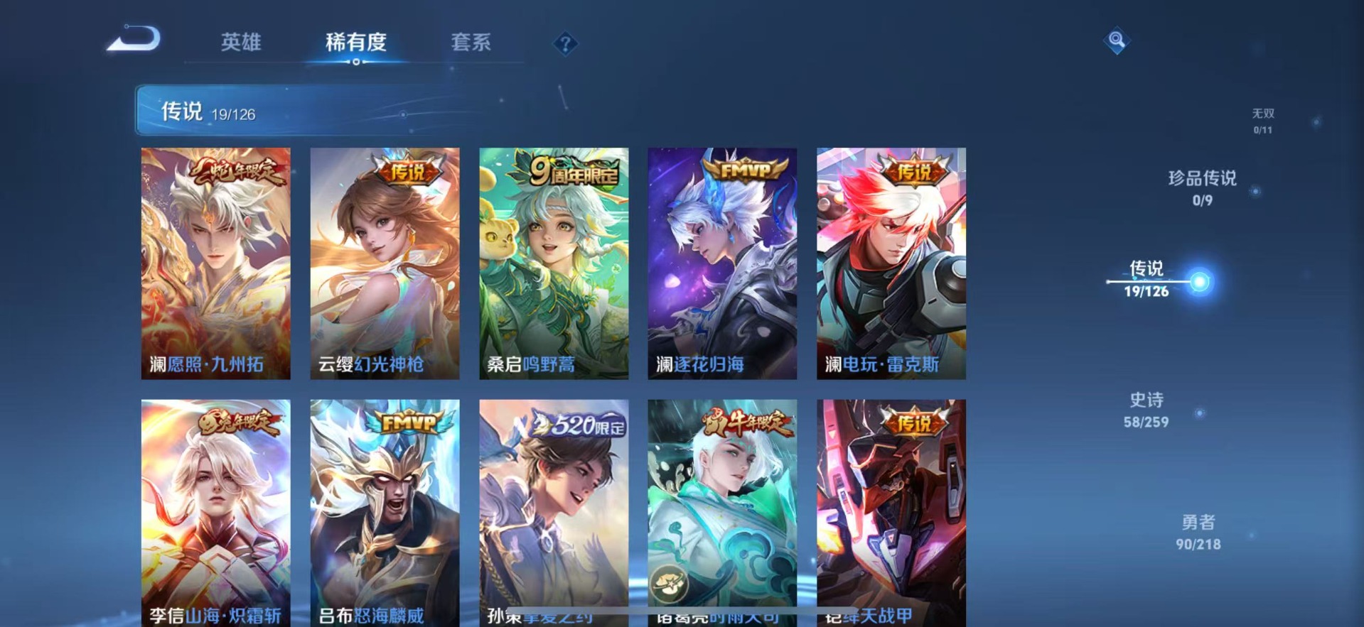 - [12293913]V8 2典藏 1珍品传说 13传说 125英雄 303皮肤 可修改实名 优质装备:全息碎影(猴子典藏),银白咏叹调(倪克斯侍卫),朽木白哉,黄金射手座,地狱火,超时空战士-狄仁杰,妄想实况,澜逐花归海 传说皮:落雪白狼,幻光神枪 珍宝阁皮:万物之道,优雅恋人 限定皮:愿照·九州拓(澜年限),愿照·岁时盈(虞姬年限),愿照·众生和(妲己年限),至尊宝,飞衡(韩信年限),遇见飞天,高山流水,齐天大圣,游园惊梦,梁祝,御风骁将(吕布年限),龙胆,岱宗(典韦年限),天狼溯光者,天狼征服者,李小龙,默契交锋-花木兰,猪悟能,寅虎·瑞焰(虎皮蛋子),山海·玄木吟(马可年限) 史诗皮:鸭鸭历险记-刘禅,器灵·浮梦炉,狼魂孤将,化蝶舞,星界战将,龙之律动,石田雨龙,茶境仙,琥珀纪元伽罗,百相守梦-黄忠,苍穹之光,电玩小子(小书包),黄金分割率,特工魅影,千年之狐,江河有灵,百解令(蒙犽),高渐离燃音魔法,蒙恬荣光圣徽,无限星赏官,青蛇,偶像歌手,晚萤,电玩·爆裂旋风,百相守梦(刘备),百相守梦(关羽),乱世虎臣,节奏热浪,修罗,女仆咖啡,水果甜心,星夜王子,心灵骇客,功夫厨神,暗隐猎兽者,幽灵船长,鬼剑武藏,心灵战警,舞动绿茵,地狱岩魂,纤云弄巧,繁星吟游(呼啦呼啦),拒霜思,缤纷独角兽,乘风破浪,逐浪之夏,水晶猎龙者,曙光守护者,金属风暴,原初追逐者,圣诞狂欢,圣诞恋歌,鹰眼统帅,魅力维加斯,无心,未来纪元-赵云,玫瑰异探
