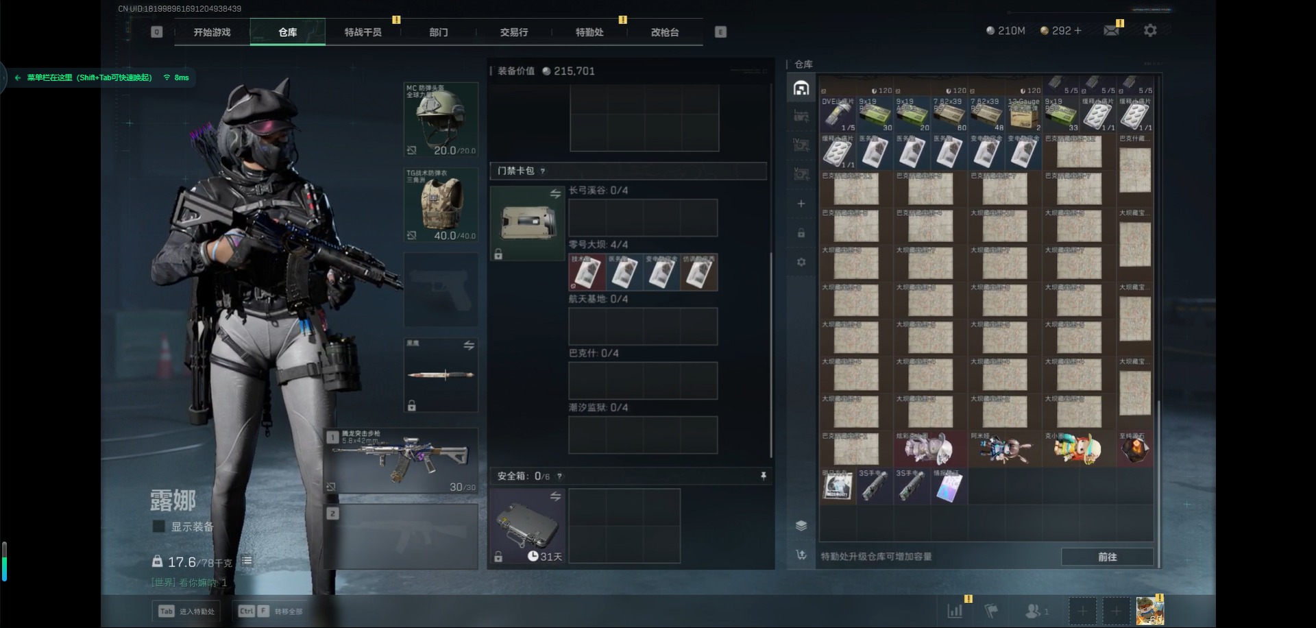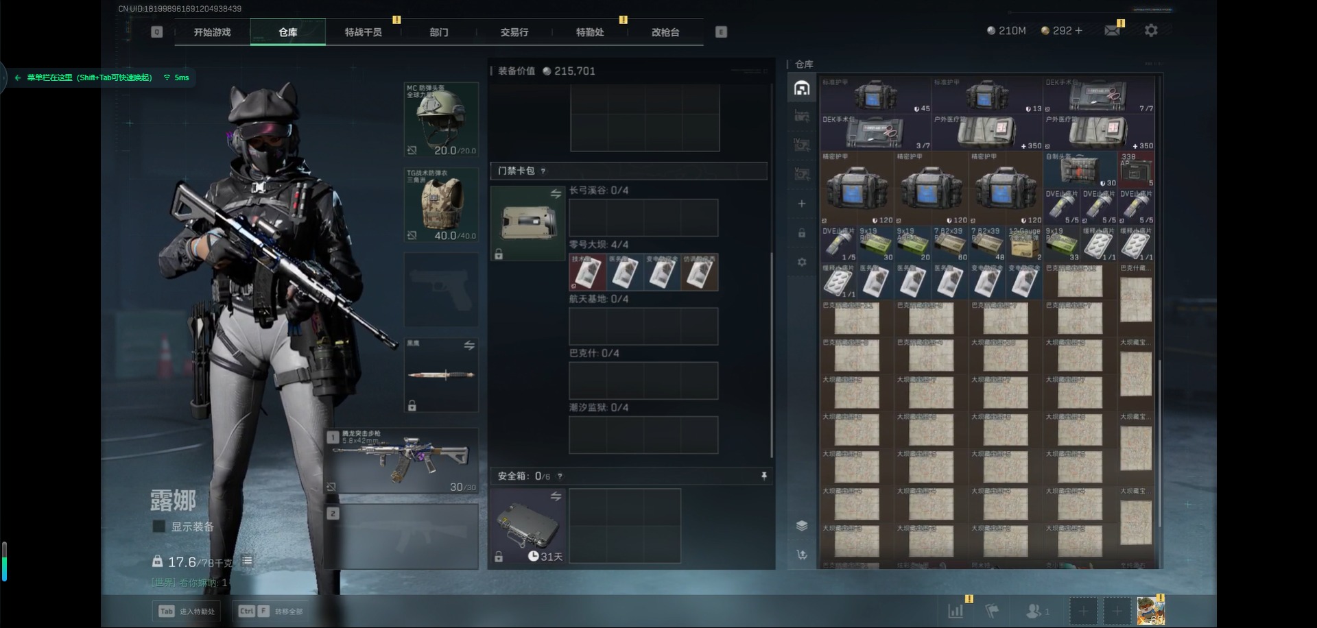 [11553795]总资产:305 2干员外观 5传说枪械 高级安全箱(2×3)9.15号到期 可二次 可修改实名 烽火地带段位:青铜 全面战场段位:无段位 哈夫币:210 传说武器皮肤:M16A4突击步枪-狩猎时刻,G3战斗步枪-狩猎时刻,Vector冲锋枪-狩猎时刻,M4A1突击步枪-阿米娅,725双管霰弹枪-送葬人-无题密令 史诗武器皮肤:PKM通用机枪-蝮蛇,PKM通用机枪-荒野求生,SR-3M紧凑突击步枪-荒野求生,SVD狙击步枪-荒野求生,SV-98狙击步枪-林中猎手,PSG-1射手步枪-无垢,腾龙突击步枪-无垢,MP7冲锋枪-无垢 干员外观:蜂医-送葬人·无题密令(S5),露娜-黑·天际线