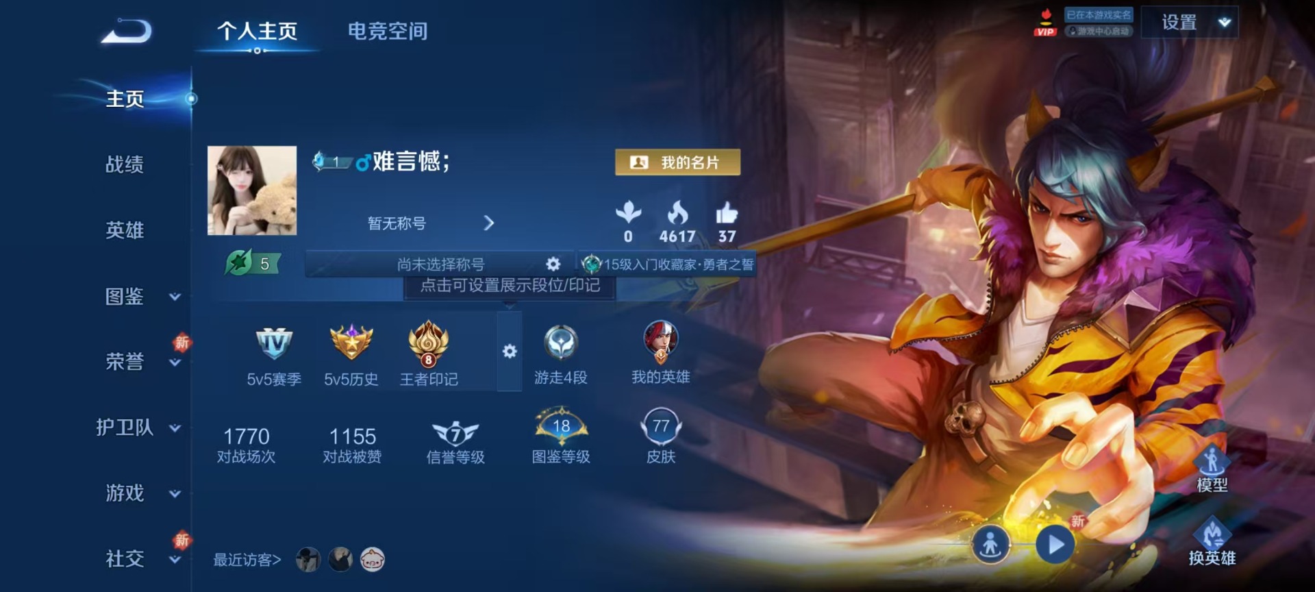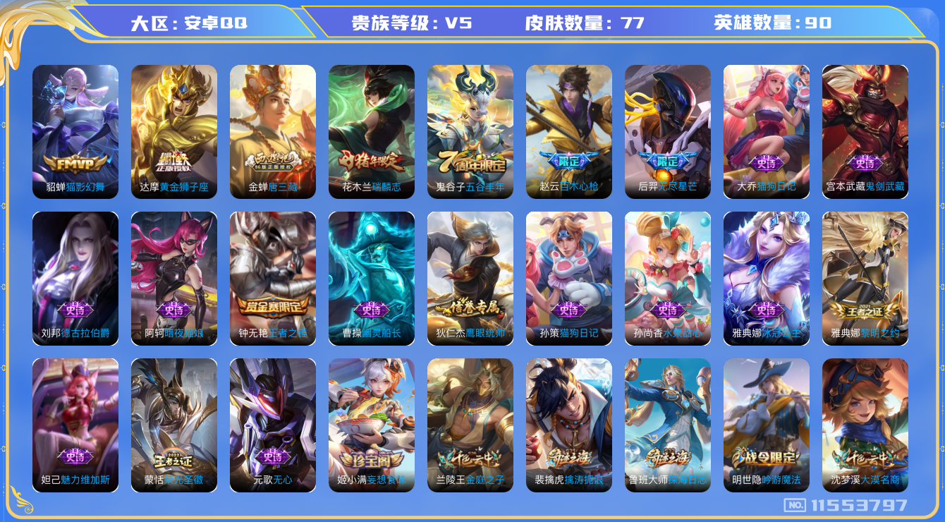 [11553797]V5 3传说 90英雄 77皮肤 可修改实名 优质装备:黄金狮子座,猫影幻舞 珍宝阁皮:妄想食味 限定皮:瑞麟志(木兰年限),五谷丰年,百木心枪,无尽星芒,唐三藏 史诗皮:蒙恬荣光圣徽,暗夜猫娘,冰冠公主,猫狗日记-孙策,猫狗日记-大乔,水果甜心,德古拉伯爵,幽灵船长,鬼剑武藏,鹰眼统帅,王者之锤,魅力维加斯,黎明之约,无心