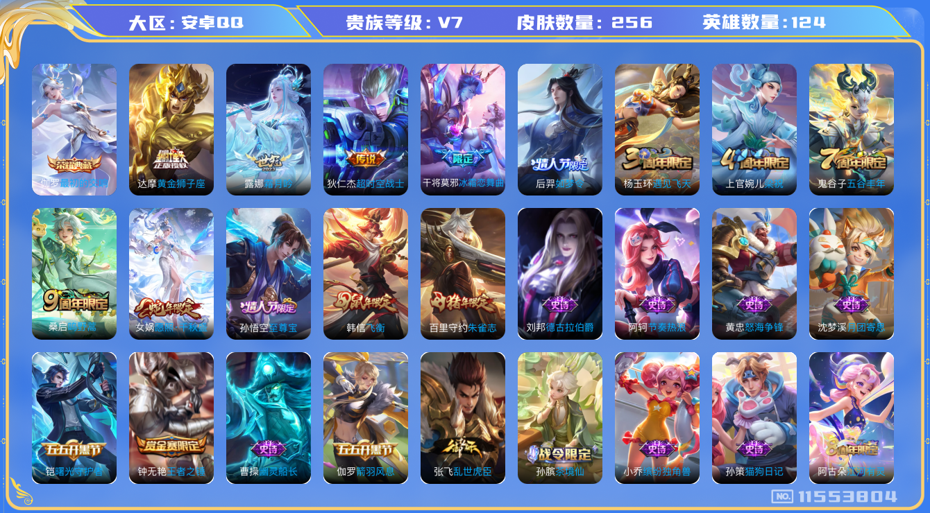 [11553804]V7 1典藏 5传说 124英雄 256皮肤 可修改实名 优质装备:最初的交响(伽罗典藏),黄金狮子座,超时空战士-狄仁杰,霜月吟 珍宝阁皮:妄想食味,玩趣恶龙 限定皮:愿照·千秋盛(女娲年限),鸣野蒿,至尊宝,飞衡(韩信年限),遇见飞天,五谷丰年,梁祝,朱雀志(守约年限),如梦令-后羿,冰霜恋舞曲 史诗皮:器灵·浮梦炉,星界战将,茶境仙,怒海争锋,百相守梦-百里守约,紫霞仙子,白龙吟,黄金分割率,特工魅影,千年之狐,电玩·爆裂旋风,江河有灵,百解令(蒙犽),蒙恬荣光圣徽,龙骑士(小龙虾),冰冠公主,末日机甲-吕布,猫狗日记-孙策,乱世虎臣,节奏热浪,修罗,女仆咖啡,摇滚巨星,水果甜心,天才门将,星夜王子,心灵骇客,功夫厨神,德古拉伯爵,暗隐猎兽者,幽灵船长,鬼剑武藏,心灵战警,纤云弄巧,缤纷独角兽,逐浪之夏,月团寄思,水晶猎龙者,曙光守护者,箭羽风息,金属风暴,原初追逐者,圣诞狂欢,圣诞恋歌,鹰眼统帅,王者之锤,魅力维加斯,黎明之约,未来纪元-赵云
