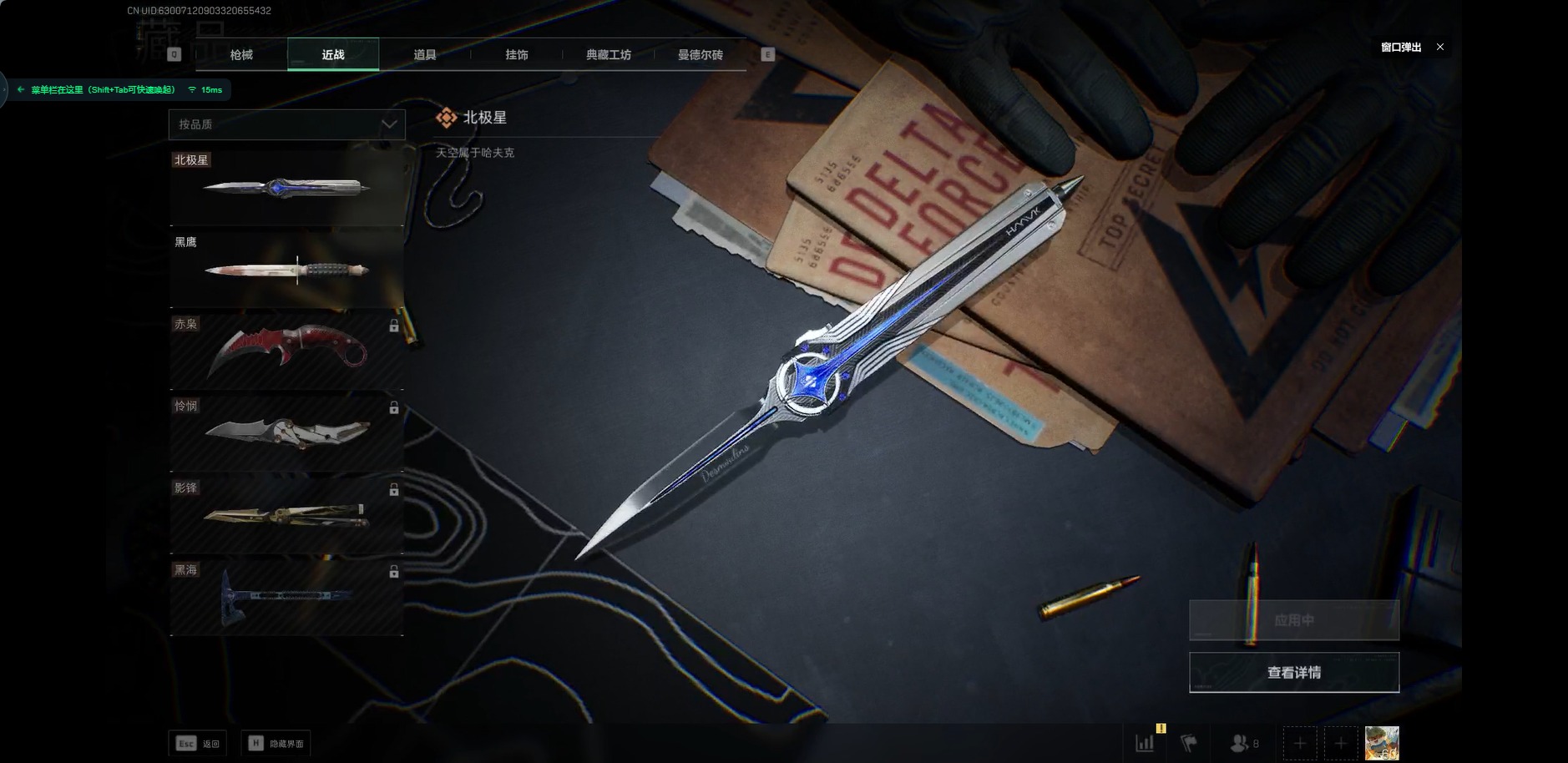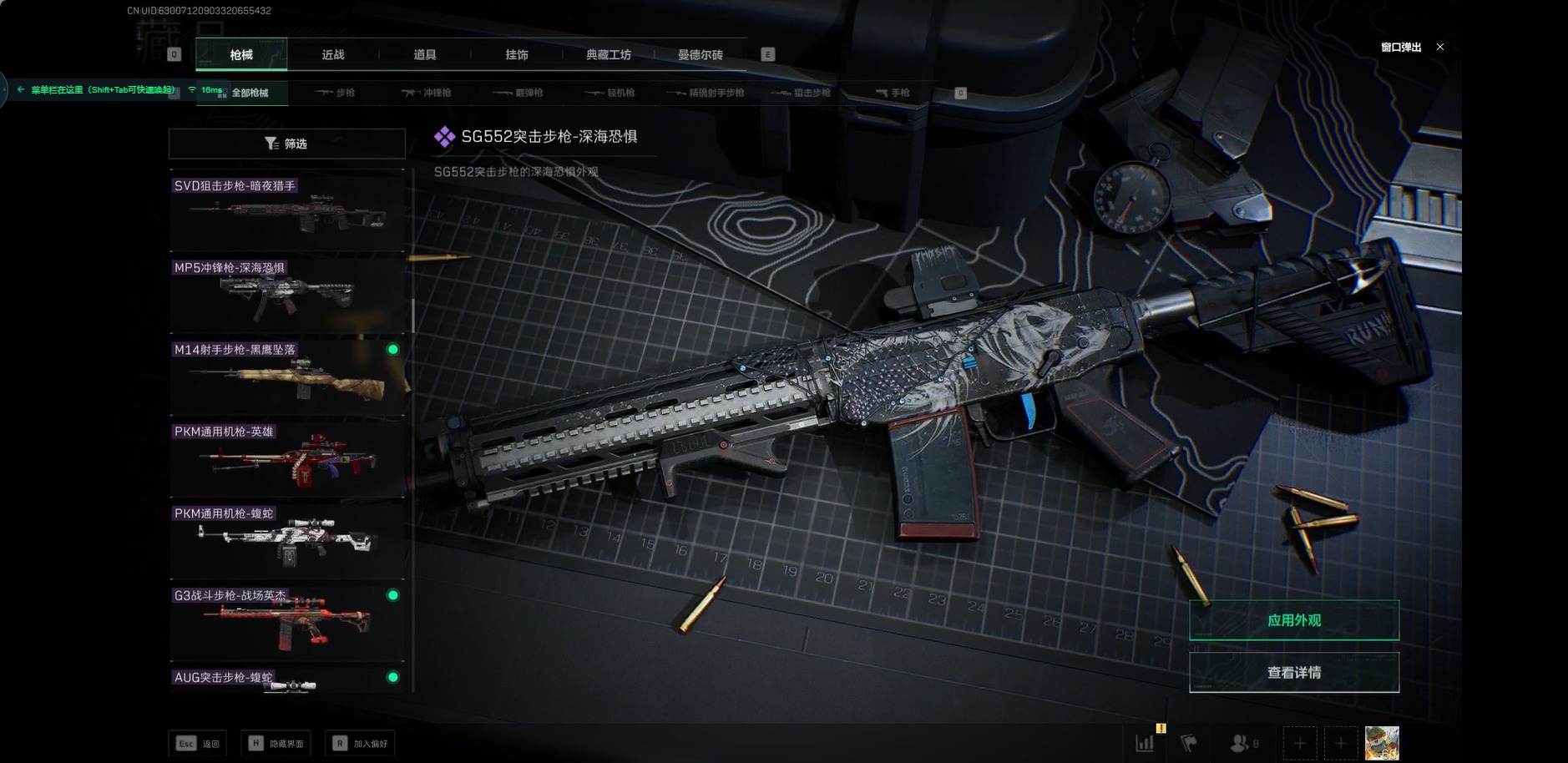 - [11524696]总资产:9 1近战传说 5传说枪械 高级安全箱(9.17到期) 可二次 可修改实名 烽火地带段位:钻石 全面战场段位:列兵 哈夫币:0 传说武器皮肤:近战-黑海,SMG45冲锋枪-骑士,QJB201轻机枪-黑海,复合弓-黑-天际线,M4A1突击步枪-蚀金玫瑰 史诗武器皮肤:QBZ95-1突击步枪-ACE,M4A1突击步枪-特勤执行,SKS射手步枪-ACE,PKM通用机枪-蝮蛇,PKM通用机枪-荒野求生,M700狙击步枪-守夜人,MP5冲锋枪-深海恐惧,勇士冲锋枪-深海恐惧,AKM突击步枪-林中猎手,SVD狙击步枪-暗夜猎手,M1014霰弹枪-林中猎手,PSG-1射手步枪-无垢,SV-98狙击步枪-囚徒,QBZ95-1突击步枪-曙光,沙漠之鹰-曙光,M700狙击步枪-竞技风