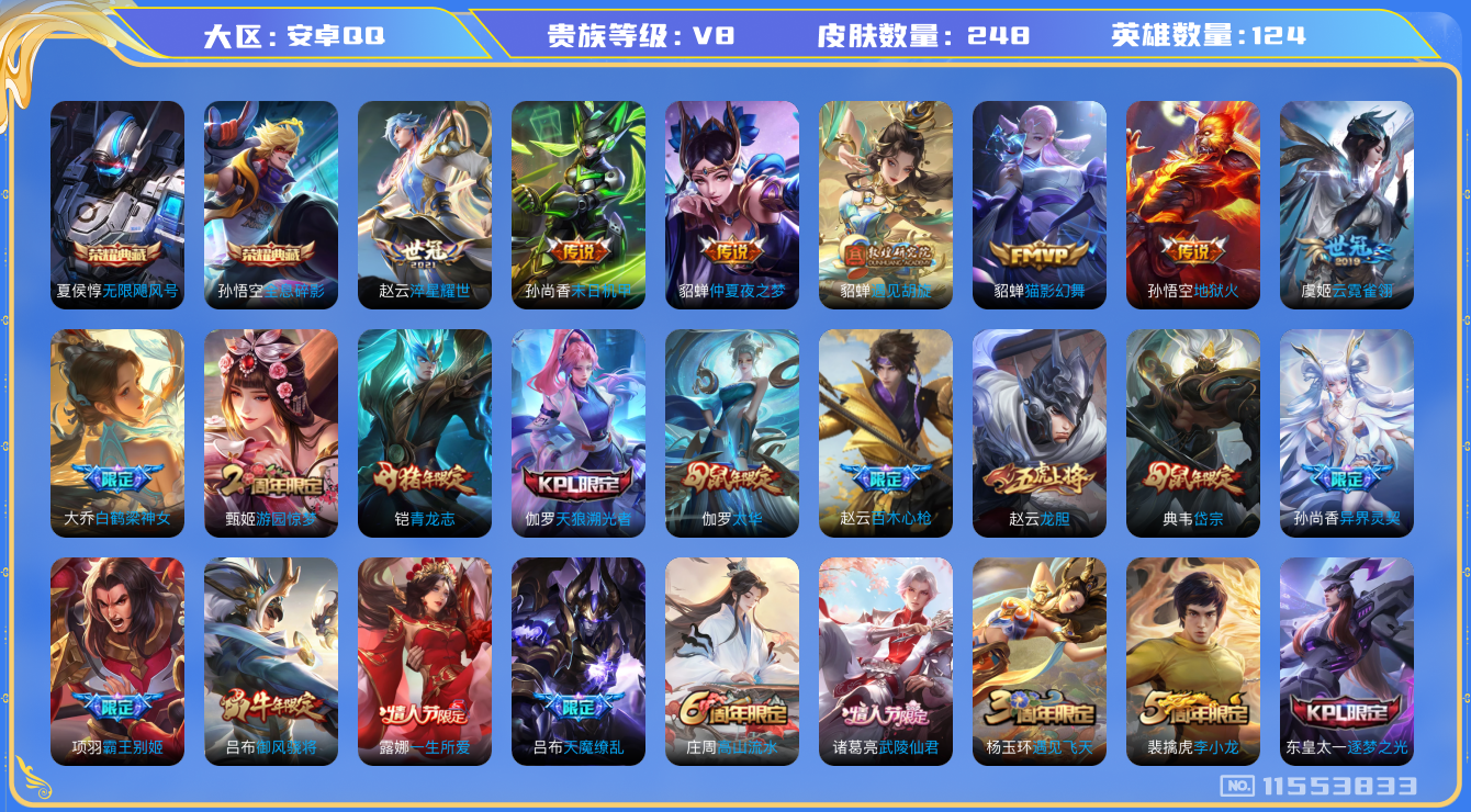 [11553833]V8 2典藏 17传说 124英雄 248皮肤 可修改实名 优质装备:无限飓风号(高达),全息碎影(猴子典藏),猫影幻舞,云霓雀翎,末日机甲-孙尚香(绿蚂蚱),地狱火,仲夏夜之梦(大飞蛾),淬星耀世,遇见胡旋 珍宝阁皮:优雅恋人,蔷薇恋人 限定皮:愿照·岁时盈(虞姬年限),愿照·众生和(妲己年限),至尊宝,白虎志(电光耗子),太华(伽罗年限),武陵仙君(小桃花),异界灵契(白毛香),白鹤梁神女,白晶晶,遇见飞天,高山流水,齐天大圣,青龙志(铠年限),冰锋战神,游园惊梦,梁祝,御风骁将(吕布年限),龙胆,岱宗(典韦年限),天狼溯光者,李小龙,逐梦之光,永曜之星,霸王别姬-项羽,霸王别姬-虞姬,孙行者,猪悟能,一生所爱,大圣娶亲,天魔缭乱,热情桑巴,百木心枪 史诗皮:器灵·浮梦炉,化蝶舞,龙之律动,石田雨龙,百相守梦-黄忠,苍穹之光,电玩小子(小书包),白龙吟,特工魅影,千年之狐,偶像歌手,暗夜猫娘,冰冠公主,猫狗日记-大乔,时之恋人-孙尚香,乱世虎臣,节奏热浪,女仆咖啡,水果甜心,星夜王子,心灵骇客,时之奇旅-安琪拉,功夫厨神,德古拉伯爵,暗隐猎兽者,幽灵船长,鬼剑武藏,心灵战警,天秀·启明,舞动绿茵,纤云弄巧,繁星吟游(呼啦呼啦),拒霜思,缤纷独角兽,乘风破浪,逐浪之夏,水晶猎龙者,唤灵魅影,金属风暴,原初追逐者,圣诞狂欢,圣诞恋歌,鹰眼统帅,暗夜贵公子,魅力维加斯,黎明之约,未来纪元-赵云