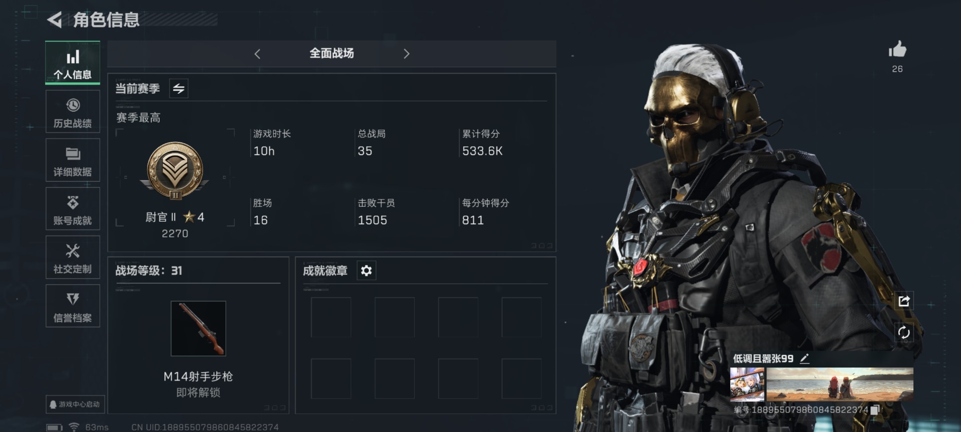 [11553836]总资产:298.6 2干员外观 4传说枪械 高级安全箱(2×3)9.15号到期 可二次 可修改实名 烽火地带段位:黄金 全面战场段位:尉官 哈夫币:131 传说武器皮肤:复合弓-黑-天际线,CAR-15突击步枪-阿米娅,725双管霰弹枪-送葬人-无题密令,M4A1突击步枪-蚀金玫瑰 史诗武器皮肤:Vector冲锋枪-潜袭者,M1014霰弹枪-潜袭者,PKM通用机枪-荒野求生,SR-3M紧凑突击步枪-荒野求生,SVD狙击步枪-荒野求生,SV-98狙击步枪-林中猎手,PSG-1射手步枪-无垢,AS Val突击步枪-典狱官,SV-98狙击步枪-囚徒,腾龙突击步枪-无垢,MP7冲锋枪-无垢 干员外观:红狼-蚀金玫瑰,露娜-黑·天际线