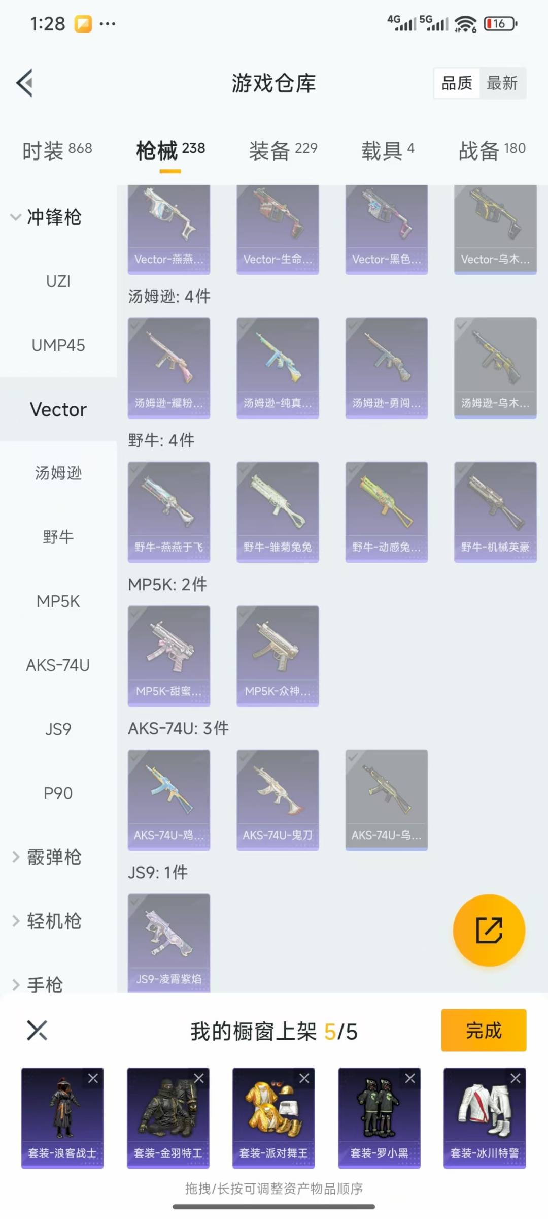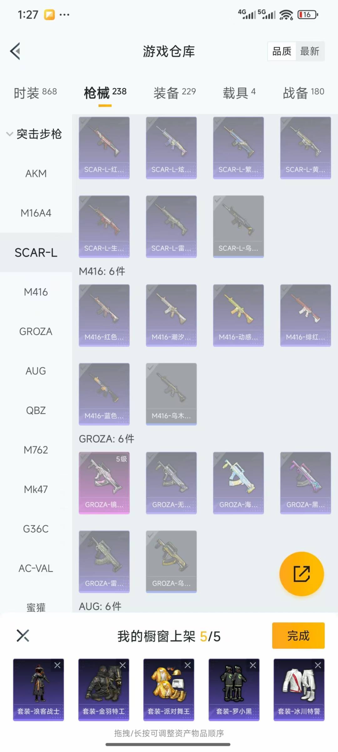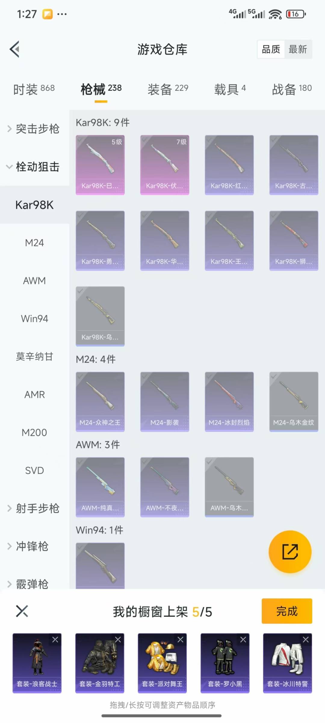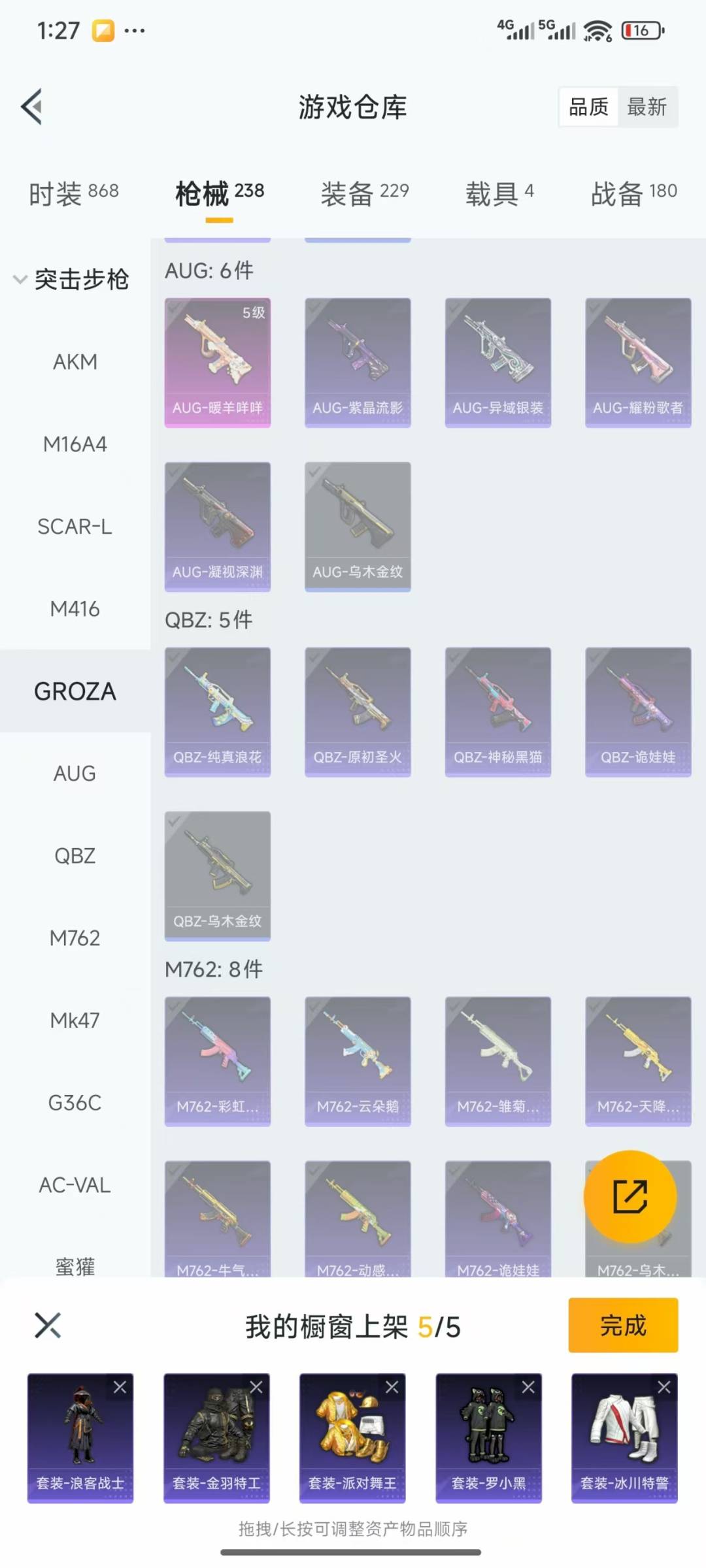 AKM-炫紫旋律,GROZA-镜光银凌,AUG-暖羊咩咩,Kar98K-巳巳如意,Kar98K-伏魔团