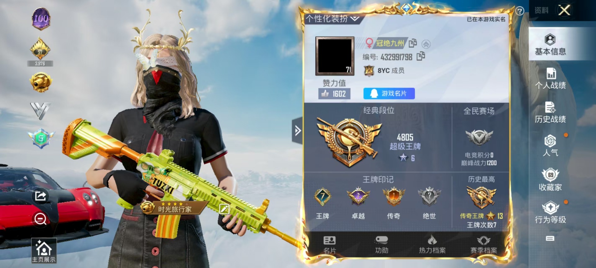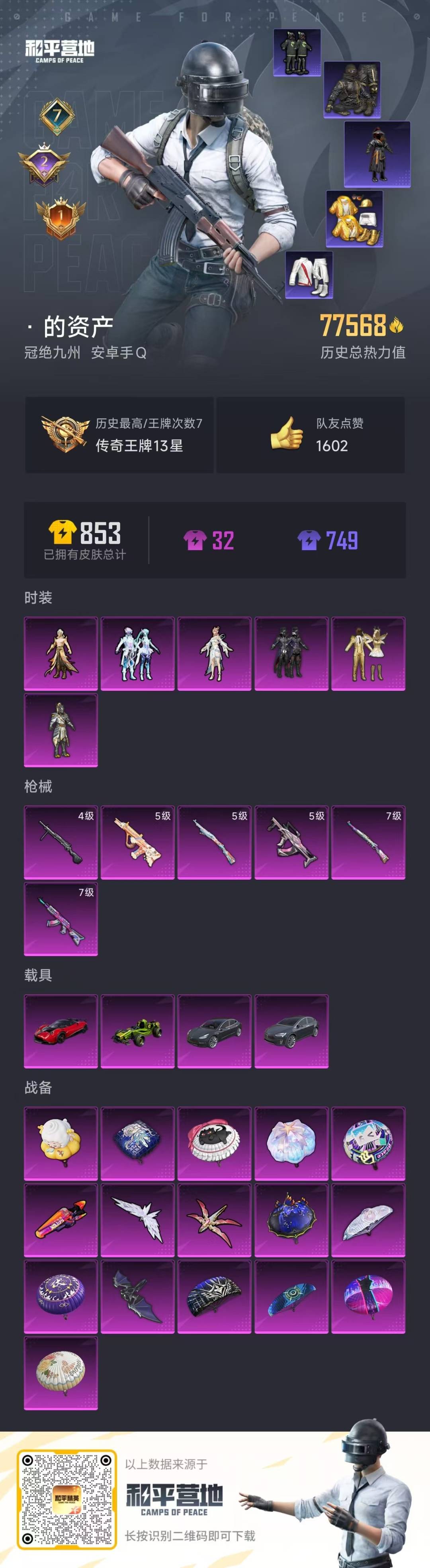 [11553851]6粉装 6特效枪 4载具 7印记 可二次 可修改实名 女号 身法装备:舞王派对(派对舞王、小金鞋) 优质装备:舞王派对(派对舞王、小金鞋) 热门装扮:月影灵韵,罗征,幻彩电音,金曜白虎,金属狂野,古堡领主,罗小黑,浪客战士,大橘为重,恒星战甲,万圣娃娃,梦魇先生,爱崽白熊,东方飞龙,派对舞王(小金鞋) 载具:帕加尼imola(光影红),合金龙骨(绿),特斯拉Model X(冷光银),特斯拉Model 3(冷光银) 稀有枪皮:AUG-暖羊咩咩,Kar98K-巳巳如意,GROZA-镜光银凌,Kar98K伏魔团,AKM炫紫旋律 七级特效枪:七级Kar98K-伏魔团,七级AKM-炫紫旋律 五级特效枪:五级GROZA-镜光银凌,五级Kar98K-巳巳如意,五级AUG-暖羊咩咩 四级特效枪:四级DP-28-豹影疾电 紫色装扮:SS22特训,SS20特训,SS21特训,SS2特训,SS3特训,SS4特训,SS5特训,人气偶像,SS30特训套装,SS23特训,霓虹热舞,SS31特训套装,云朵鹅,彩虹兔,雪绒豹,SS33特训套装,青涩时光,旭日情侣,顶瓜瓜,SS13特训,SS14特训,SS19特训,冰川特警,SS16特训,天籁歌者,SS17特训,凛冬战士,街头潮人,跃动心情,蓝彩潮人,迅猛虎鲸,都市漫游者,都市魅力,酒红色名流,野性山猫,野性战魂,金鼠迎春,竞技勇士朋克,竞技达人朋克,红色运动,绮丽涂鸦,缤纷果语,耀眼新星,长空猛禽,雨林探路者,游猎者,冰河战士,龙魂突击队,蝶变,蓝海鲸歌,龙腾端午,风暴特警,雪山征服者,雪山精英,雷霆特警,霓虹街区,青年教官,风行保卫者,龙的传人,飞行日记,魅力单车,鹤鸣,黄色伏地魔,黄色名流,黄色格斗者,黄色运动,黎明保卫者,黑色伏地魔,决胜时刻,战地督导,战地菁英,时尚圣诞,朋克治安官,极地朋克,极速红龙,格斗先锋,橘黑制服,沙漠兵团,圣诞大吉,冷焰舞者,刚毅裁决者,北国孤狼,午夜朋克,和平特警,坚韧舞者,夜莺强袭者,完美偶像,帅气教官,幻世战舞者,甜蜜告白,特战装甲,猎鹰,猛禽,王牌教练,甜蜜熊情侣,甜蜜菠萝,疯狂小兔子,白色伏地魔,潮流先锋,派对绅士,海岛探路者,深蓝色名流,湖蓝色名流,牛气满满,灰色格斗者,灼焰舞者,熔岩使者,燃烧卡路里,牛气冲天,拉斐尔,雏菊兔兔,萝兰蝴蝶,纯真浪花,热情海星,SS28特训,燕燕于飞,鱼渊荷华,巳巳如意