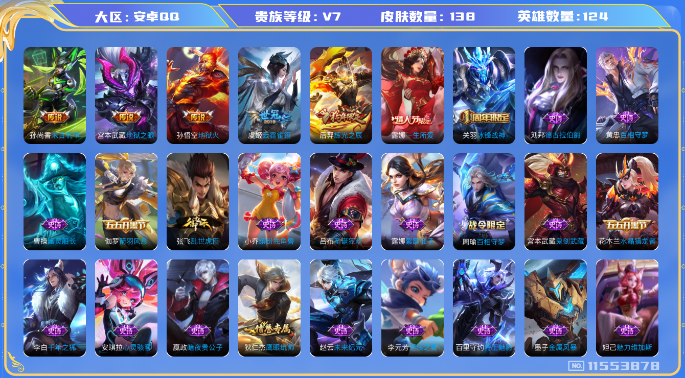 [11553878]V7 4传说 124英雄 138皮肤 可修改实名 优质装备:云霓雀翎,末日机甲-孙尚香(绿蚂蚱),地狱火,地狱之眼 限定皮:冰锋战神,辉光之辰,一生所爱 史诗皮:龙之律动,百相守梦-周瑜,百相守梦-黄忠,紫霞仙子,特工魅影,千年之狐,偶像歌手,乱世虎臣,修罗,心灵骇客,德古拉伯爵,幽灵船长,鬼剑武藏,缤纷独角兽,逐浪之夏,水晶猎龙者,箭羽风息,金属风暴,圣诞狂欢,鹰眼统帅,暗夜贵公子,魅力维加斯,未来纪元-赵云