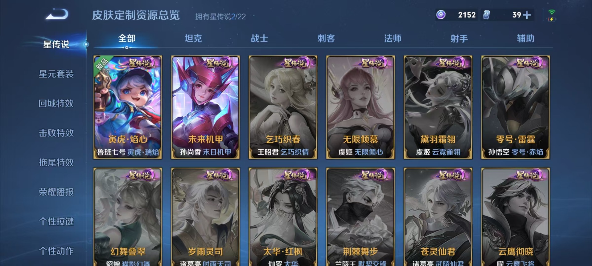 黄忠烈魂,铠青龙志,伽罗天狼溯光者,赵云百木心枪,赵云龙胆,孙膑天狼运算者,干将莫邪冰霜恋舞曲,孙尚香异界灵契,鲁班七号乒乒小将,鲁班七号寅虎·瑞焰,后羿辉光之辰,露娜一生所爱,公孙离玉兔公主,裴擒虎李小龙,上官婉儿梁祝,上官婉儿天狼绘梦者,花木兰瑞麟志,桑启鸣野蒿,猪八戒猪悟能,孙悟空孙行者,孙悟空大圣娶亲,孙悟空美猴王,赵云引擎之心,云中君时之祈愿,妲己时之奇旅,百里守约朱雀志,蔡文姬奇迹圣诞,关羽武圣