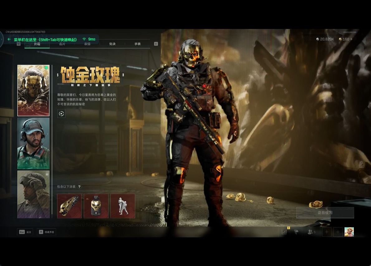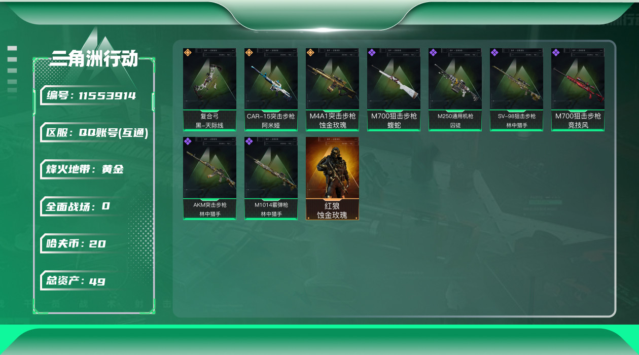 [11553914]总资产:49.9 1干员外观 3传说枪械 进阶安全箱(2×2)9.15号到期 可二次 可修改实名 烽火地带段位:黄金 全面战场段位:无段位 哈夫币:20.821 传说武器皮肤:复合弓-黑-天际线,CAR-15突击步枪-阿米娅,M4A1突击步枪-蚀金玫瑰 史诗武器皮肤:M700狙击步枪-蝮蛇,AKM突击步枪-林中猎手,M1014霰弹枪-林中猎手,SV-98狙击步枪-林中猎手,M250通用机枪-囚徒,M700狙击步枪-竞技风 干员外观:红狼-蚀金玫瑰