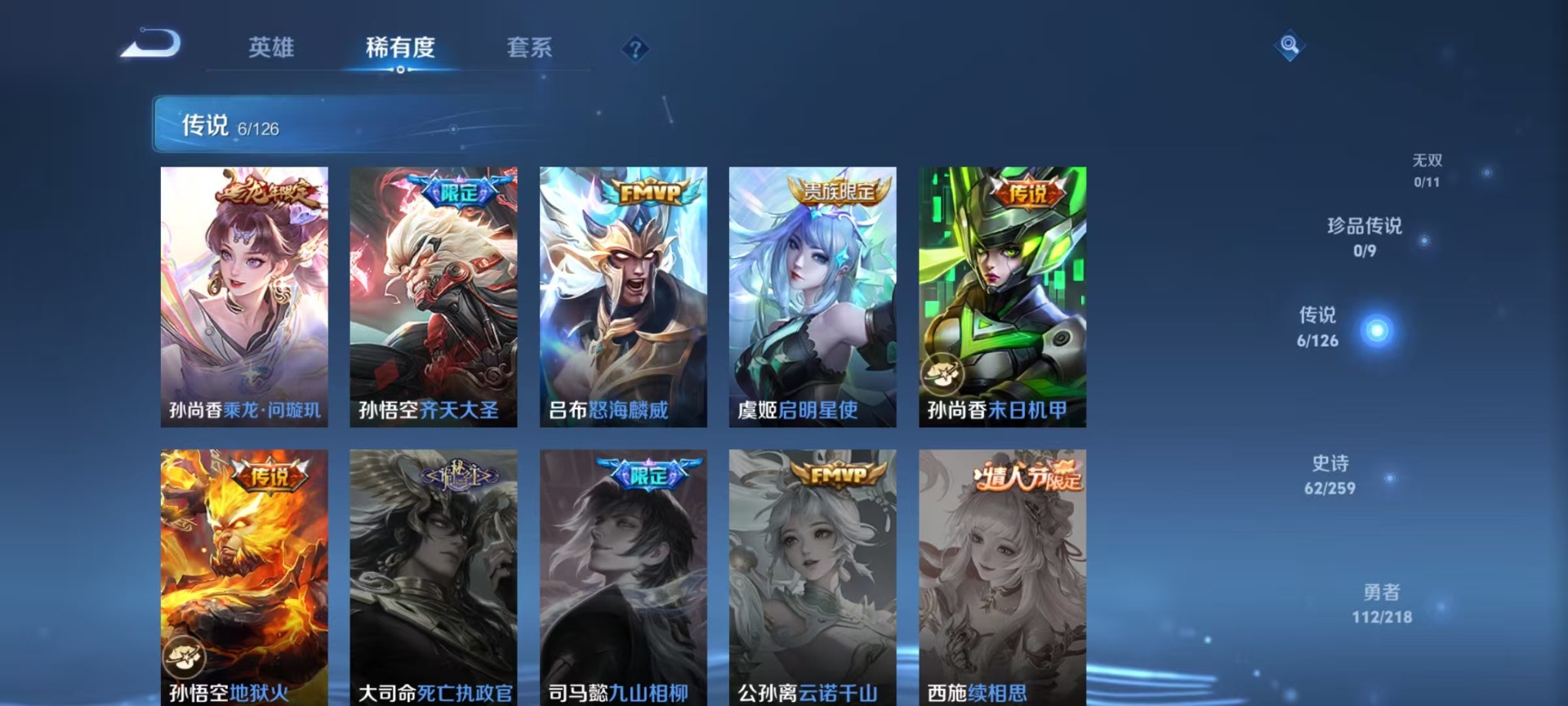 伽罗天狼溯光者,吕布御风骁将,后羿如梦令,露娜一生所爱,上官婉儿梁祝,猪八戒猪悟能,孙悟空大圣娶亲,孙悟空至尊宝