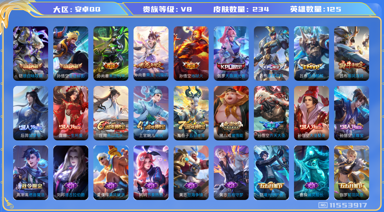 [11553917]V8 2典藏 6传说 125英雄 234皮肤 可修改实名 优质装备:全息碎影(猴子典藏),银白咏叹调(倪克斯侍卫),末日机甲-孙尚香(绿蚂蚱),地狱火 传说皮:乘龙·问璇玑(孙尚香年限) 珍宝阁皮:蔷薇恋人,女武神 限定皮:逐霄战戟,至尊宝,高山流水,齐天大圣,怒海麟威,五谷丰年,梁祝,御风骁将(吕布年限),天狼溯光者,如梦令-后羿,猪悟能,一生所爱,大圣娶亲 史诗皮:怒海争锋,蔬乡物语(鲁班七号),琥珀纪元伽罗,百相守梦-黄忠,电玩小子(小书包),白龙吟,特工魅影,永昼,电玩·爆裂旋风,雪夜绮愿(周瑜),百解令(蒙犽),高渐离燃音魔法,偶像歌手,冰冠公主,末日机甲-吕布,猫狗日记-孙策,节奏热浪,女仆咖啡,摇滚巨星,水果甜心,天才门将,心灵骇客,功夫厨神,德古拉伯爵,幽灵船长,鬼剑武藏,心灵战警,纤云弄巧,拒霜思,缤纷独角兽,乘风破浪,逐浪之夏,曙光守护者,箭羽风息,金属风暴,圣诞狂欢,圣诞恋歌,鹰眼统帅,魅力维加斯,无心,未来纪元-赵云