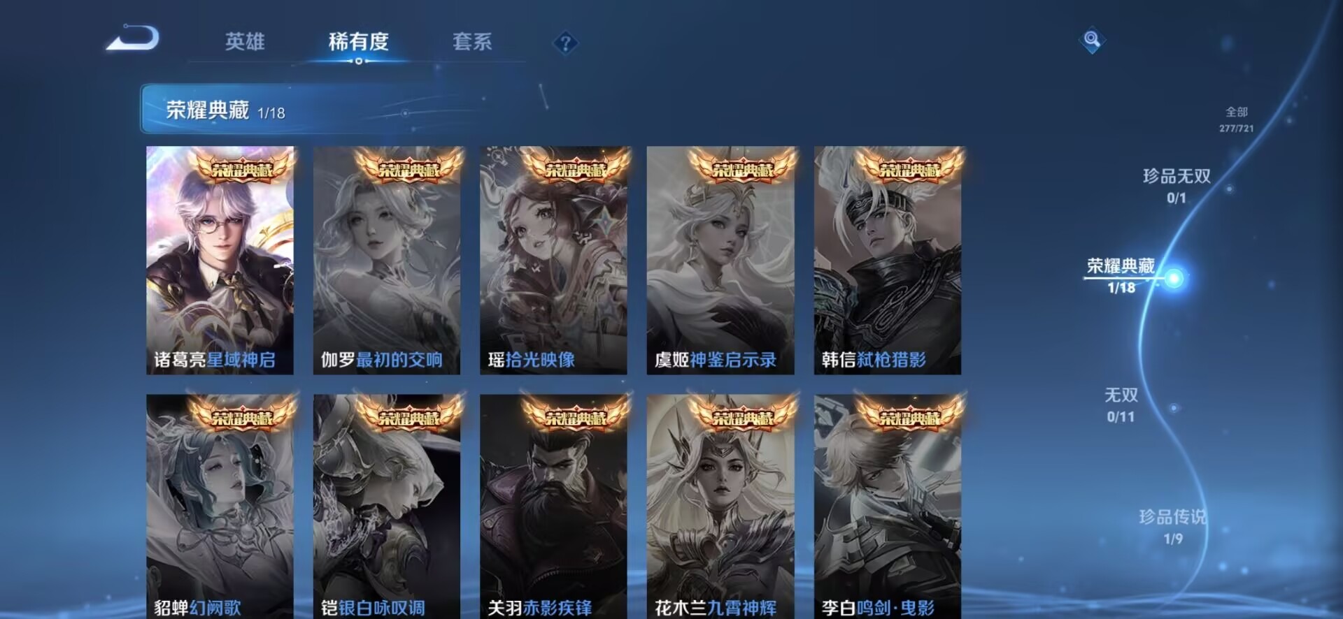 铠青龙志,廉颇寅虎·御盾,吕布御风骁将,诸葛亮时雨天司,裴擒虎李小龙,上官婉儿梁祝,马可波罗山海·玄木吟,桑启鸣野蒿,孙悟空大圣娶亲,马超神威,赵云引擎之心,澜愿照·九州拓,虞姬愿照·岁时盈,关羽冰锋战神