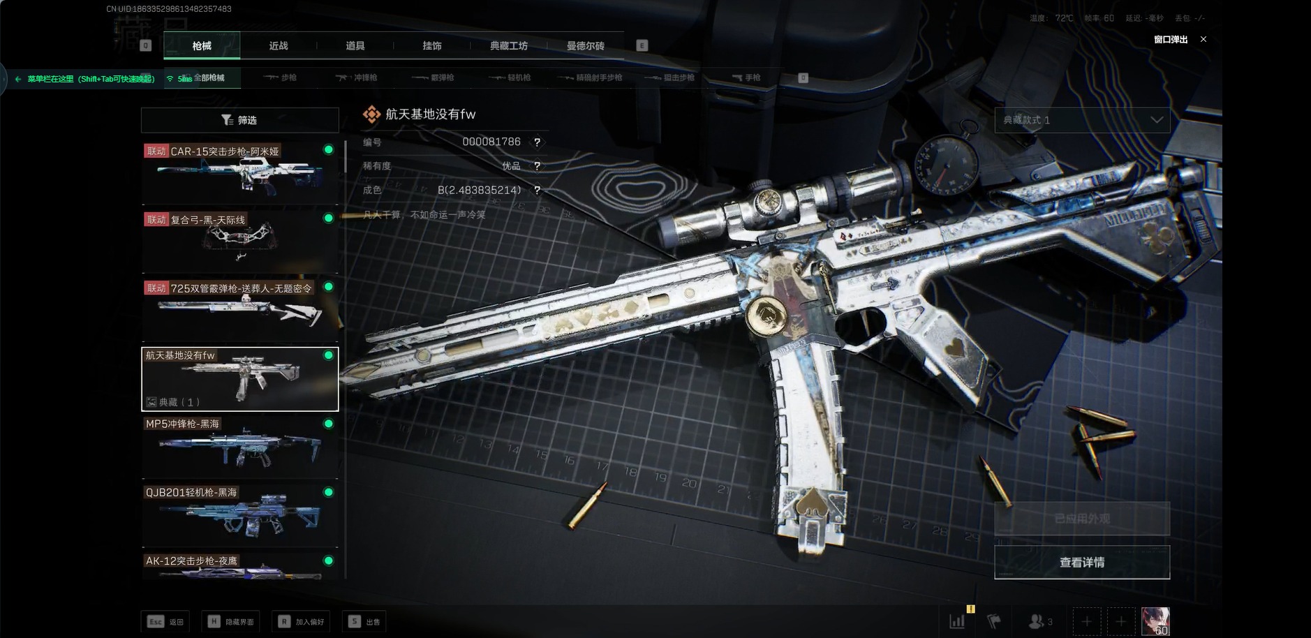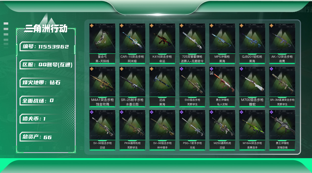 [11553962]可二次 可修改实名 实名:可修改 顶级安全箱(9.17到期) 烽火地带段位:钻石 全面战场段位:上等兵 总资产:66.6 哈夫币:1.310 传说武器皮肤:近战-黑海,K416突击步枪-命运(典藏),SR-25射手步枪-水墨云图,AK-12突击步枪-夜鹰,QJB201轻机枪-黑海,MP5冲锋枪-黑海,复合弓-黑-天际线,CAR-15突击步枪-阿米娅,725双管霰弹枪-送葬人-无题密令,M4A1突击步枪-蚀金玫瑰 史诗武器皮肤:勇士冲锋枪-私人定制(典藏),SR-3M紧凑突击步枪-英雄,M700狙击步枪-蝮蛇,SR-25射手步枪-尖端治疗,PKM通用机枪-荒野求生,AS Val突击步枪-尖端治疗,M700狙击步枪-守夜人,SG552突击步枪-尖端治疗,Ash-12战斗步枪-守夜人,MP5冲锋枪-深海恐惧,SR-3M紧凑突击步枪-荒野求生,勇士冲锋枪-深海恐惧,AKM突击步枪-林中猎手,SVD狙击步枪-暗夜猎手,M16A4突击步枪-竞赛选手,PKM通用机枪-守夜人,SVD狙击步枪-荒野求生,M1014霰弹枪-林中猎手,SV-98狙击步枪-林中猎手,PTR-32突击步枪-英雄,PSG-1射手步枪-无垢,M250通用机枪-囚徒,SV-98狙击步枪-囚徒,QSZ92G-风林火山 干员外观:红狼-蚀金玫瑰