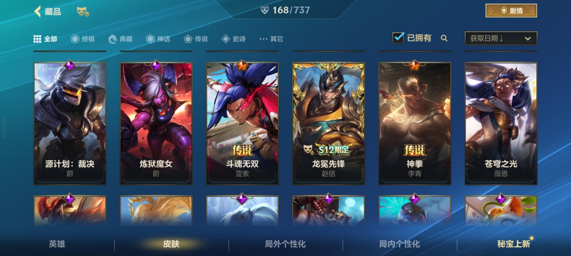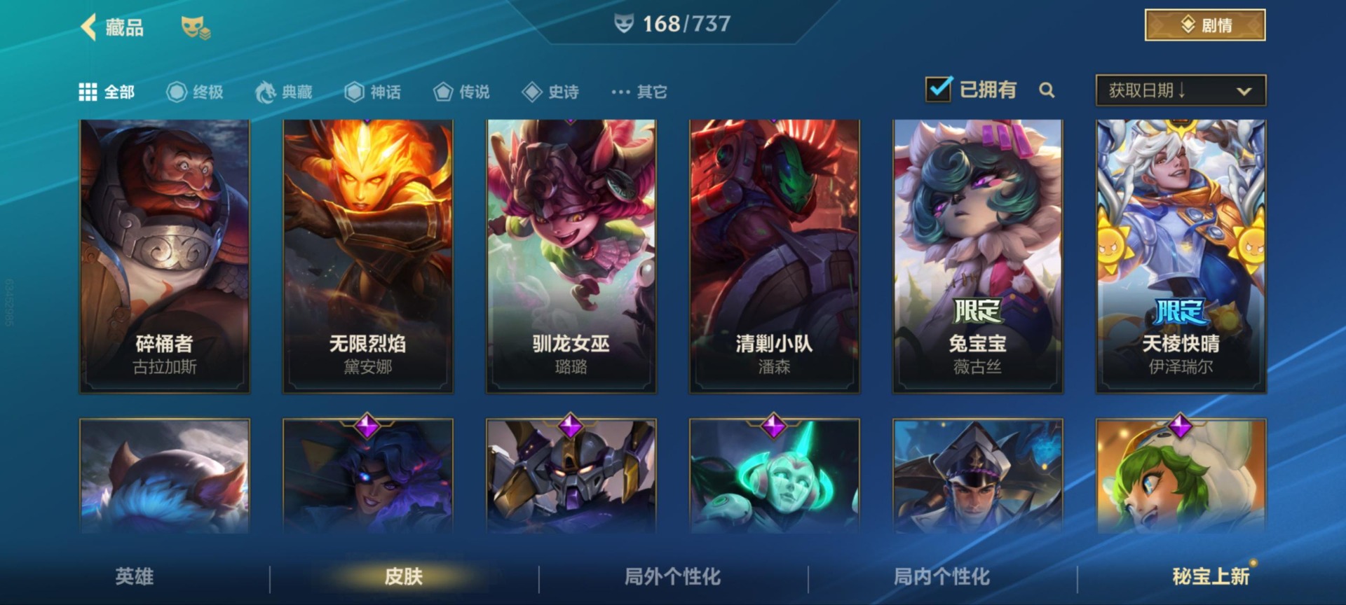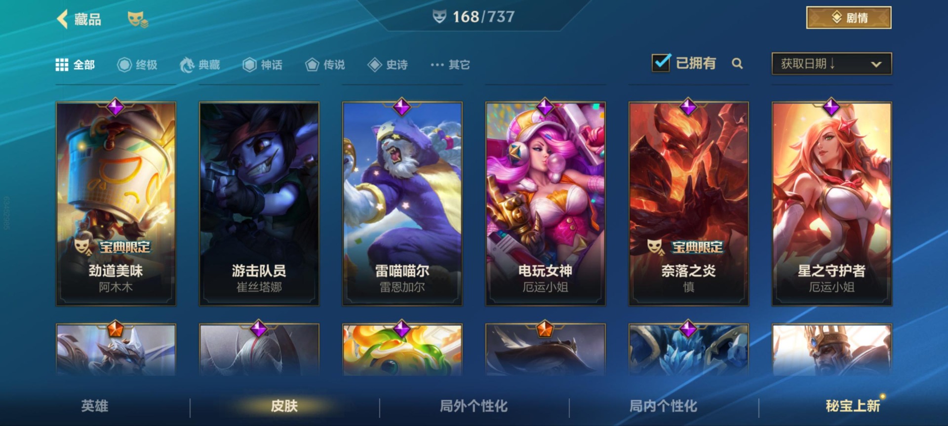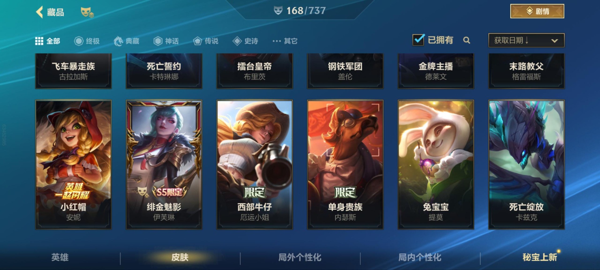 - [12173842]1终极 9神话 37限定 25传说 46史诗 253皮肤 83炫彩 171英雄 可二次 可修改实名 优质装备:至臻 K/DA 阿狸,至臻 神龙尊者 炎龙瑟提,防爆天使 凯尔,暗影 沃里克,地底世界 崔斯特,冠军典狱长 锤石,冠军之矛 滑板鞋,冠军之刃 锐雯,冠军之刃 锐雯 2016,糖果使徒 费德提克,永恒之森 乐芙兰,至臻 西部魔影 泰隆,武装战姬,冠军之箭 艾希 凯旋圣装,冠军之刃 锐雯 2016 凯旋圣装,无畏骑士 瑟庄妮 赤子初心,霸天异形 卡兹克 刹那银光,可爱可爱粉红红 布里茨,冠军之矛 卡莉丝塔 凯旋圣装,净雪之月 莫甘娜 冬虹,星之守护者 阿卡丽 热情之光,魔女 阿卡丽 虚荣,至臻 凯旋将军 德莱厄斯,殿堂传奇 薇恩,至臻 灵魂莲华 劫,暗裔英雄 盖伦,殿堂传奇 薇恩 登神 限定:创星之灵 璐璐 赛季限定皮:胜利剑圣 易,胜利巨口 克格莫,胜利之树 茂凯,胜利枪神 格雷福斯,胜利女神 奥利安娜,胜利之剑 剑魔,胜利枪神 卢锡安 冠军限定系列:S1FNC 酒桶,S2 暗杀星 慎,S4 SSW 图奇,S7 SSG 霞 冰雪节限定:冰雪节 炼金,魄罗骑士 瑟庄妮,幸福女神 乐芙兰,雪球也能爆炸 吉格斯 泳池派对:泳池派对 厄运小姐,泳池派对 黑默丁格,泳池派对 凯特琳,泳池派对 球女,海之歌 艾希 万圣节限定:魅惑女巫 崔丝塔娜,魅惑女巫 娜美,南瓜头 费德提克 年限:点心宝贝 阿木木,天龙之子 斯莫德,蛇年 库奇 周年:10周年 安妮,10周年 凤凰