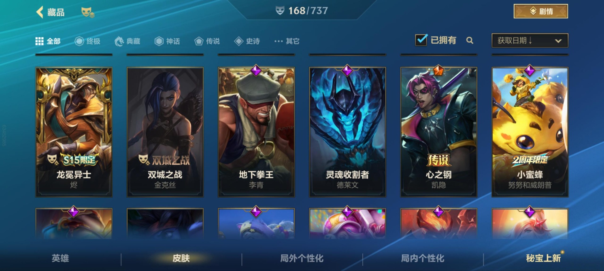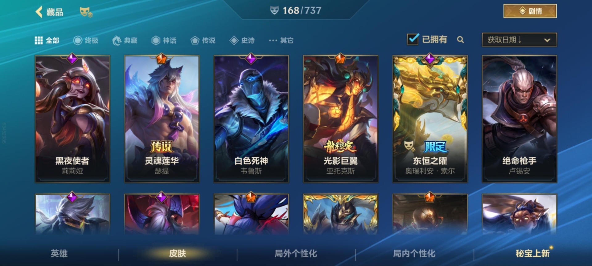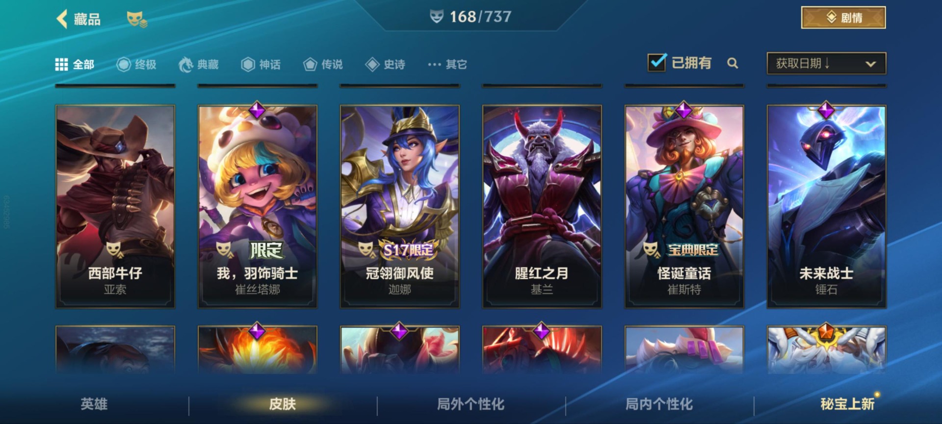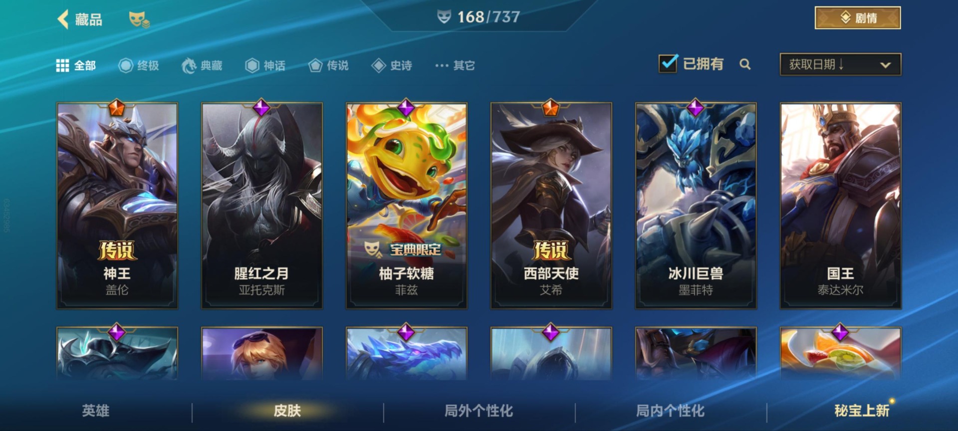 - [12173842]1终极 9神话 37限定 25传说 46史诗 253皮肤 83炫彩 171英雄 可二次 可修改实名 优质装备:至臻 K/DA 阿狸,至臻 神龙尊者 炎龙瑟提,防爆天使 凯尔,暗影 沃里克,地底世界 崔斯特,冠军典狱长 锤石,冠军之矛 滑板鞋,冠军之刃 锐雯,冠军之刃 锐雯 2016,糖果使徒 费德提克,永恒之森 乐芙兰,至臻 西部魔影 泰隆,武装战姬,冠军之箭 艾希 凯旋圣装,冠军之刃 锐雯 2016 凯旋圣装,无畏骑士 瑟庄妮 赤子初心,霸天异形 卡兹克 刹那银光,可爱可爱粉红红 布里茨,冠军之矛 卡莉丝塔 凯旋圣装,净雪之月 莫甘娜 冬虹,星之守护者 阿卡丽 热情之光,魔女 阿卡丽 虚荣,至臻 凯旋将军 德莱厄斯,殿堂传奇 薇恩,至臻 灵魂莲华 劫,暗裔英雄 盖伦,殿堂传奇 薇恩 登神 限定:创星之灵 璐璐 赛季限定皮:胜利剑圣 易,胜利巨口 克格莫,胜利之树 茂凯,胜利枪神 格雷福斯,胜利女神 奥利安娜,胜利之剑 剑魔,胜利枪神 卢锡安 冠军限定系列:S1FNC 酒桶,S2 暗杀星 慎,S4 SSW 图奇,S7 SSG 霞 冰雪节限定:冰雪节 炼金,魄罗骑士 瑟庄妮,幸福女神 乐芙兰,雪球也能爆炸 吉格斯 泳池派对:泳池派对 厄运小姐,泳池派对 黑默丁格,泳池派对 凯特琳,泳池派对 球女,海之歌 艾希 万圣节限定:魅惑女巫 崔丝塔娜,魅惑女巫 娜美,南瓜头 费德提克 年限:点心宝贝 阿木木,天龙之子 斯莫德,蛇年 库奇 周年:10周年 安妮,10周年 凤凰