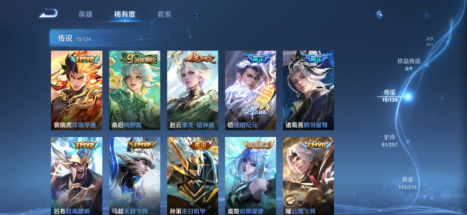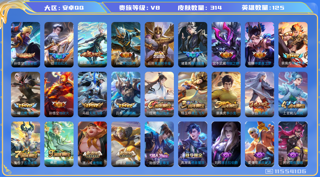 [11554106]V8 1典藏 15传说 125英雄 314皮肤 可修改实名 荣耀水晶:全息碎影(猴子典藏) 传说皮:琥珀纪元铠,乘龙·铭钟鼎(赵云年限),祥瑞亨通,黄金射手座,地狱火,仲夏夜之梦(大飞蛾),地狱之眼,云鹰飞将(小将军),无双飞将,末日机甲-孙策,鹤羽星尊 珍宝阁皮:妄想食味,优雅恋人,蔷薇恋人 限定皮:鸣野蒿,至尊宝,凤求凰(白切鸡),遇见飞天,高山流水,怒海麟威,五谷丰年,梁祝,李小龙,孙行者,猪悟能 史诗皮:星界战将,龙之律动,蔬乡物语(鲁班七号),白龙吟,特工魅影,千年之狐,真我赫兹(百里守约),鹤归松栖(赵怀真),末日机甲-莱西奥,江河有灵,高渐离燃音魔法,蒙恬荣光圣徽,冰冠公主,偶像歌手,晚萤,电玩·爆裂旋风,暗夜猫娘,龙骑士(小龙虾),末日机甲-吕布,猫狗日记-孙策,乱世虎臣,节奏热浪,女仆咖啡,摇滚巨星,水果甜心,绅士熊喵,天才门将,星夜王子,心灵骇客,功夫厨神,德古拉伯爵,暗隐猎兽者,幽灵船长,心灵战警,舞动绿茵,地狱岩魂,纤云弄巧,缤纷独角兽,乘风破浪,逐浪之夏,月团寄思,水晶猎龙者,曙光守护者,金属风暴,原初追逐者,圣诞狂欢,圣诞恋歌,鹰眼统帅,王者之锤,暗夜贵公子,魅力维加斯,黎明之约,无心,未来纪元-赵云